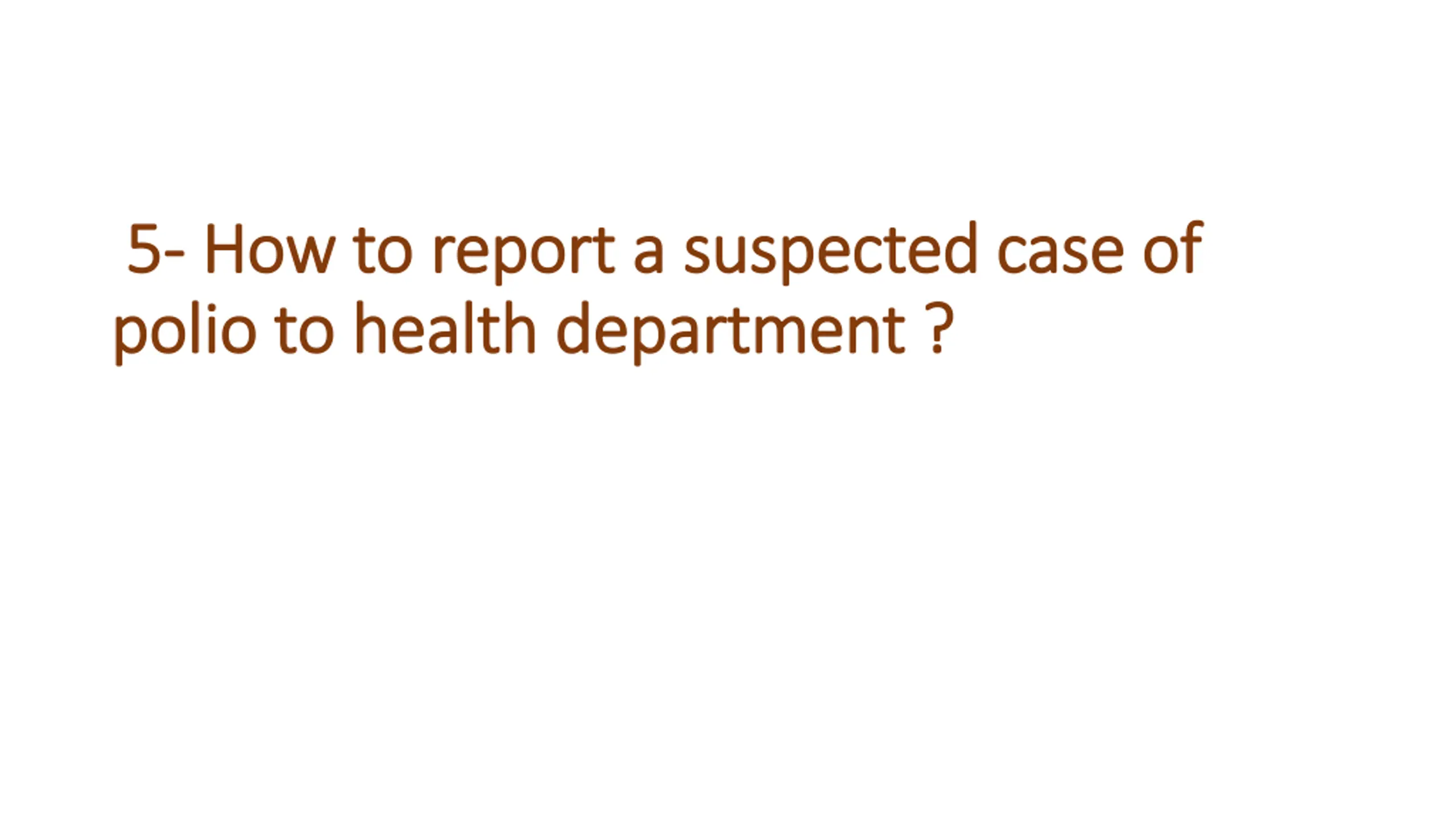 5 5- - How to report a suspected case of How to report a suspected case of polio to health department polio to health department ? ?