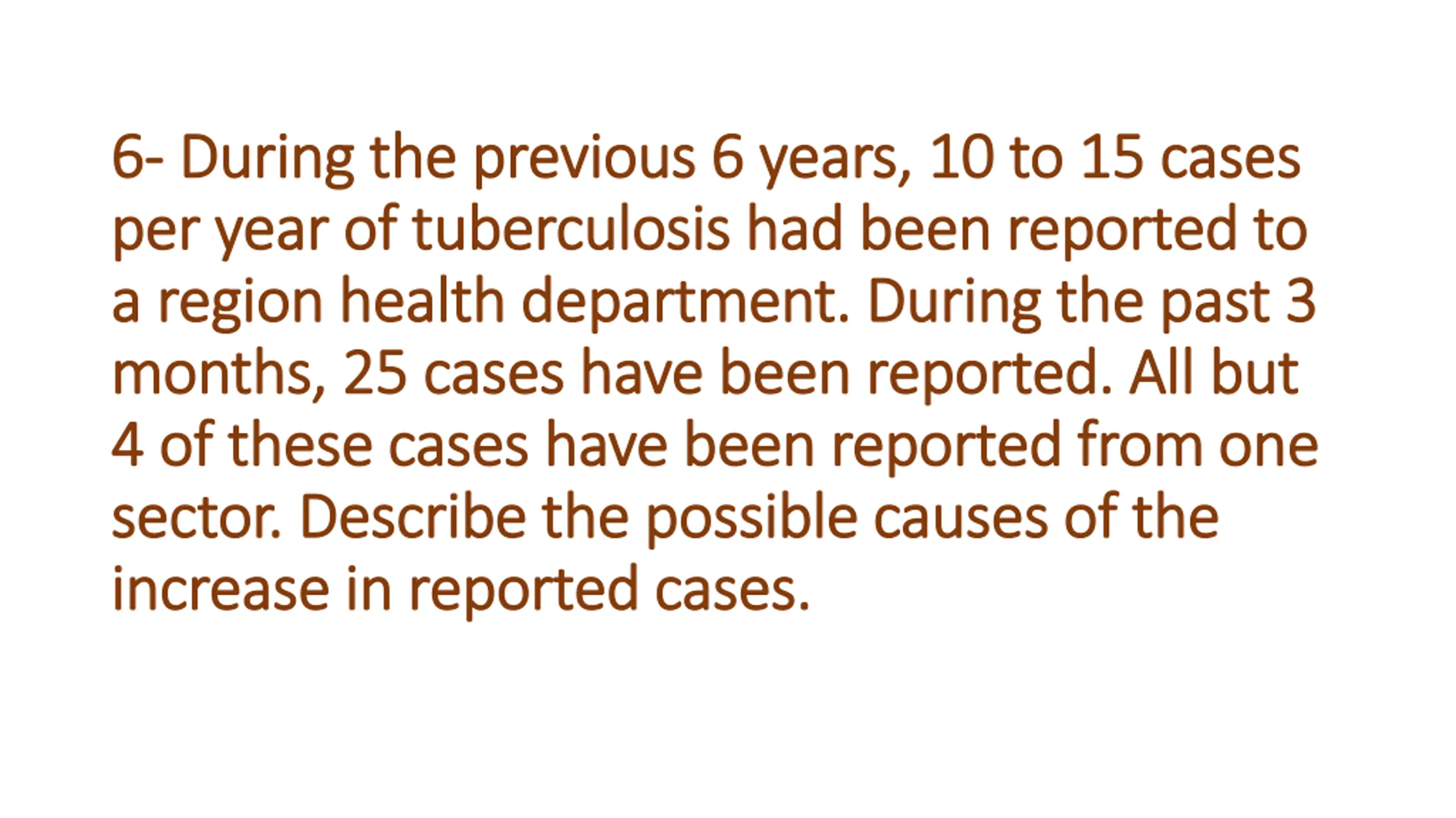 6 6- - During the previous 6 years, 10 to 15 cases During the previous 6 years, 10 to 15 cases per year of tuberculosis had been reported to per year of tuberculosis had been reported to a region health department. During the past 3 a region health department. During the past 3 months, 25 cases have been reported. All but months, 25 cases have been reported. All but 4 of these cases have been reported from one 4 of these cases have been reported from one sector. Describe the possible causes of the sector. Describe the possible causes of the increase in reported cases. increase in reported cases.