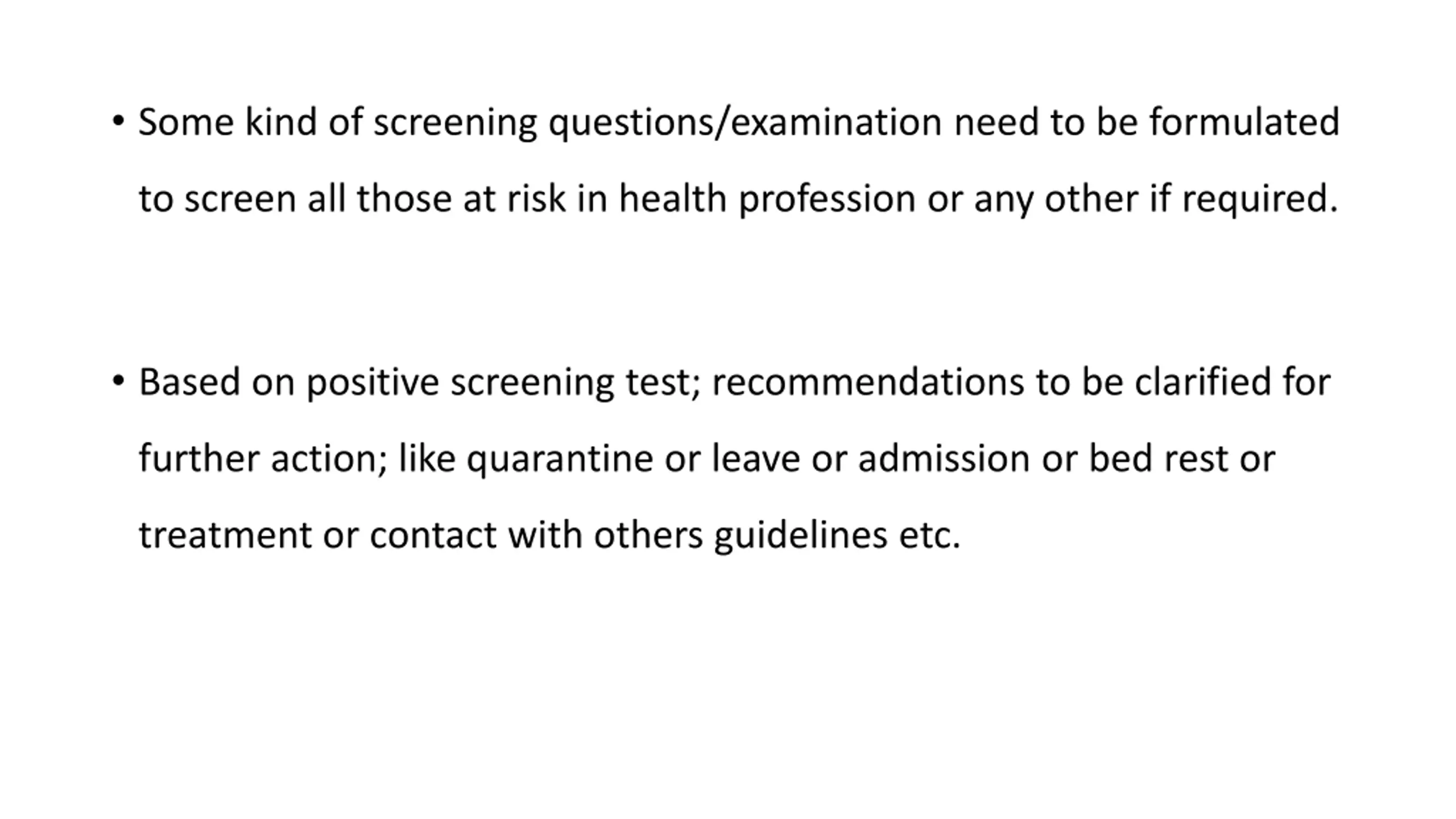 Some kind of screening questions/examination need to be formulated to screen all those at risk in health profession or any other if required. Based on positive screening test; recommendations to be clarified for further action; like quarantine or leave or admission or bed rest or treatment or contact with others guidelines etc.
