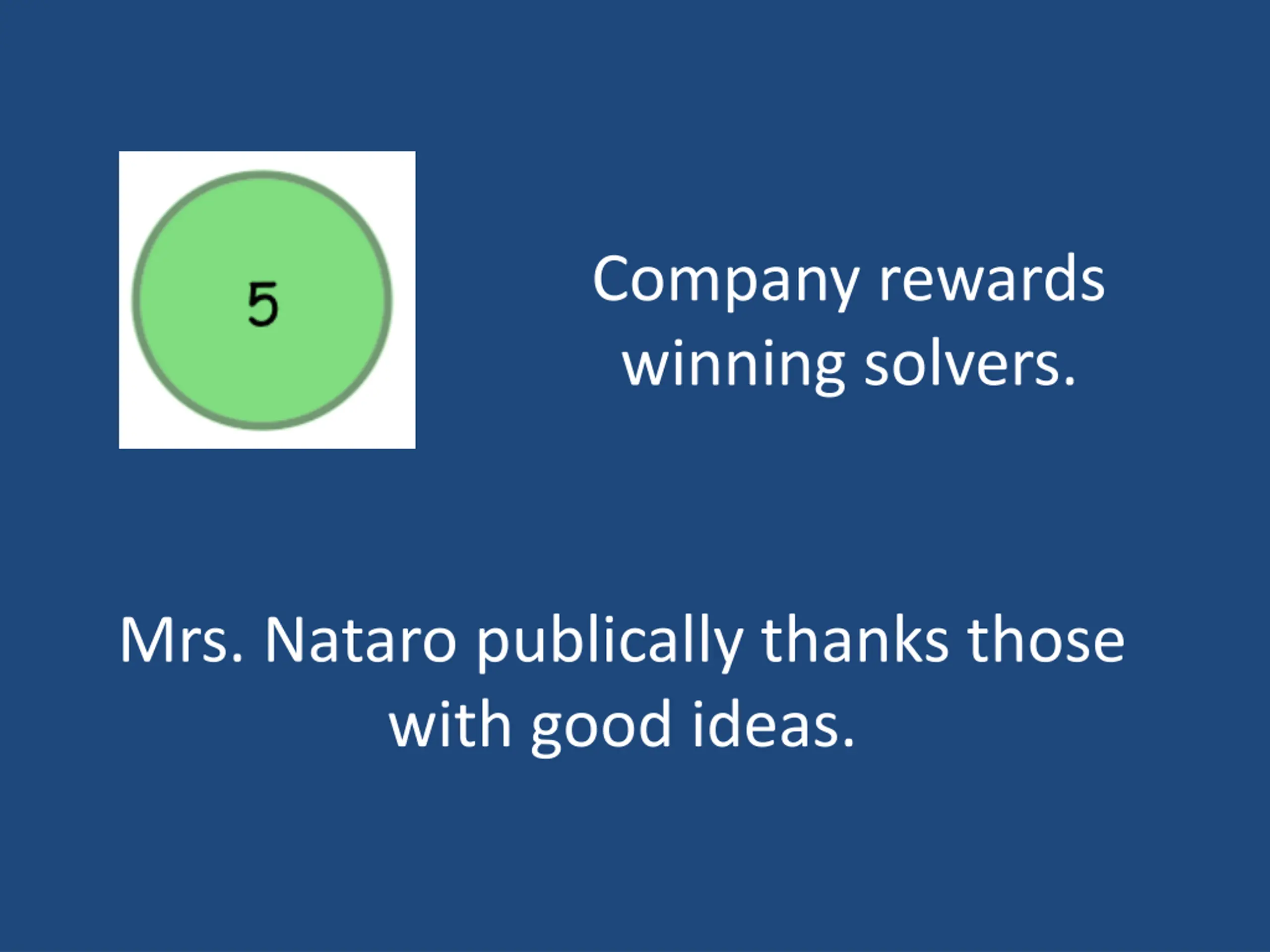 Company rewards winning solvers. Mrs. Nataro publically thanks those with good ideas.