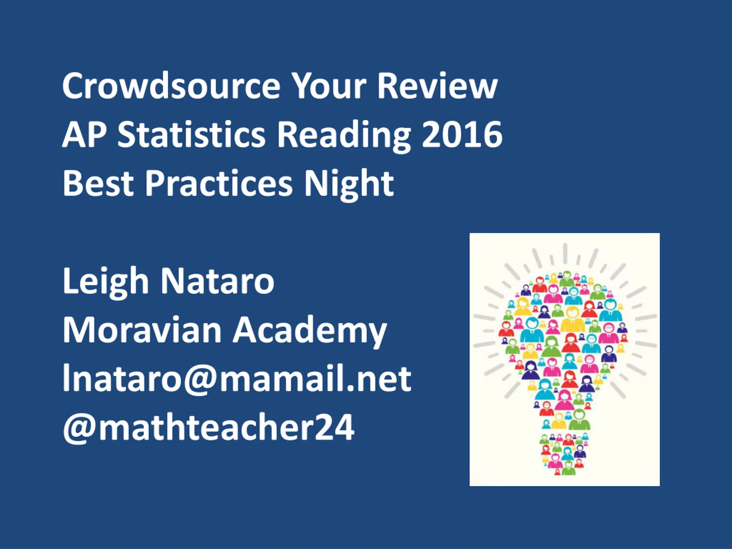 Crowdsource Your Review AP Statistics Reading 2016 Best Practices Night Leigh Nataro Moravian Academy lnataro@mamail.net @mathteacher24