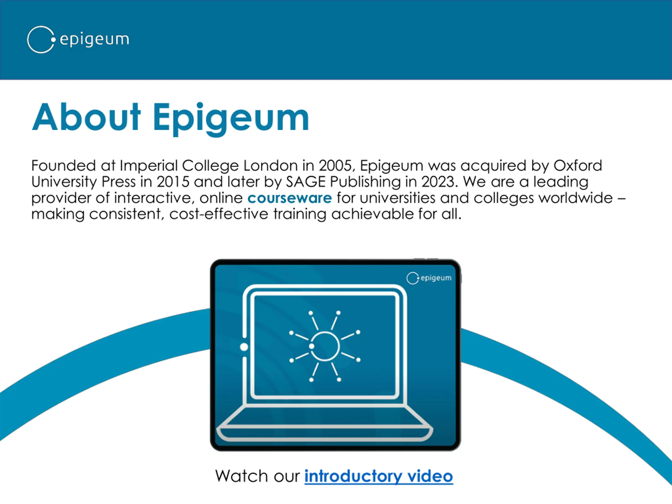 About Epigeum Founded at Imperial College London in 2005, Epigeum was acquired by Oxford University Press in 2015 and later by SAGE Publishing in 2023. We are a leading provider of interactive, online courseware for universities and colleges worldwide making consistent, cost-effective training achievable for all. Watch our introductory video