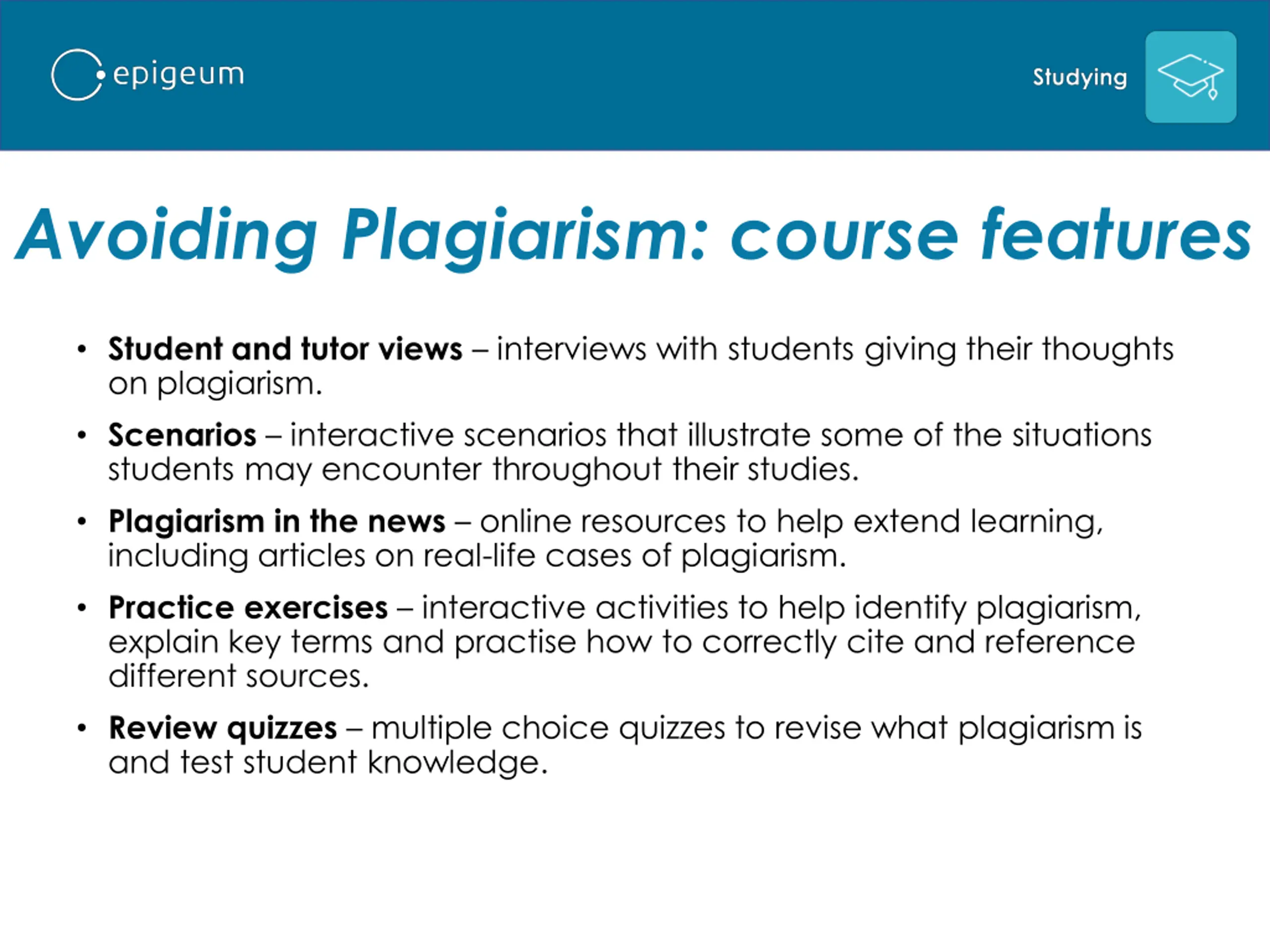 Avoiding Plagiarism: course features Student and tutor views interviews with students giving their thoughts on plagiarism. Scenarios interactive scenarios that illustrate some of the situations students may encounter throughout their studies. Plagiarism in the news online resources to help extend learning, including articles on real-life cases of plagiarism. Practice exercises interactive activities to help identify plagiarism, explain key terms and practise how to correctly cite and reference different sources. Review quizzes multiple choice quizzes to revise what plagiarism is and test student knowledge.