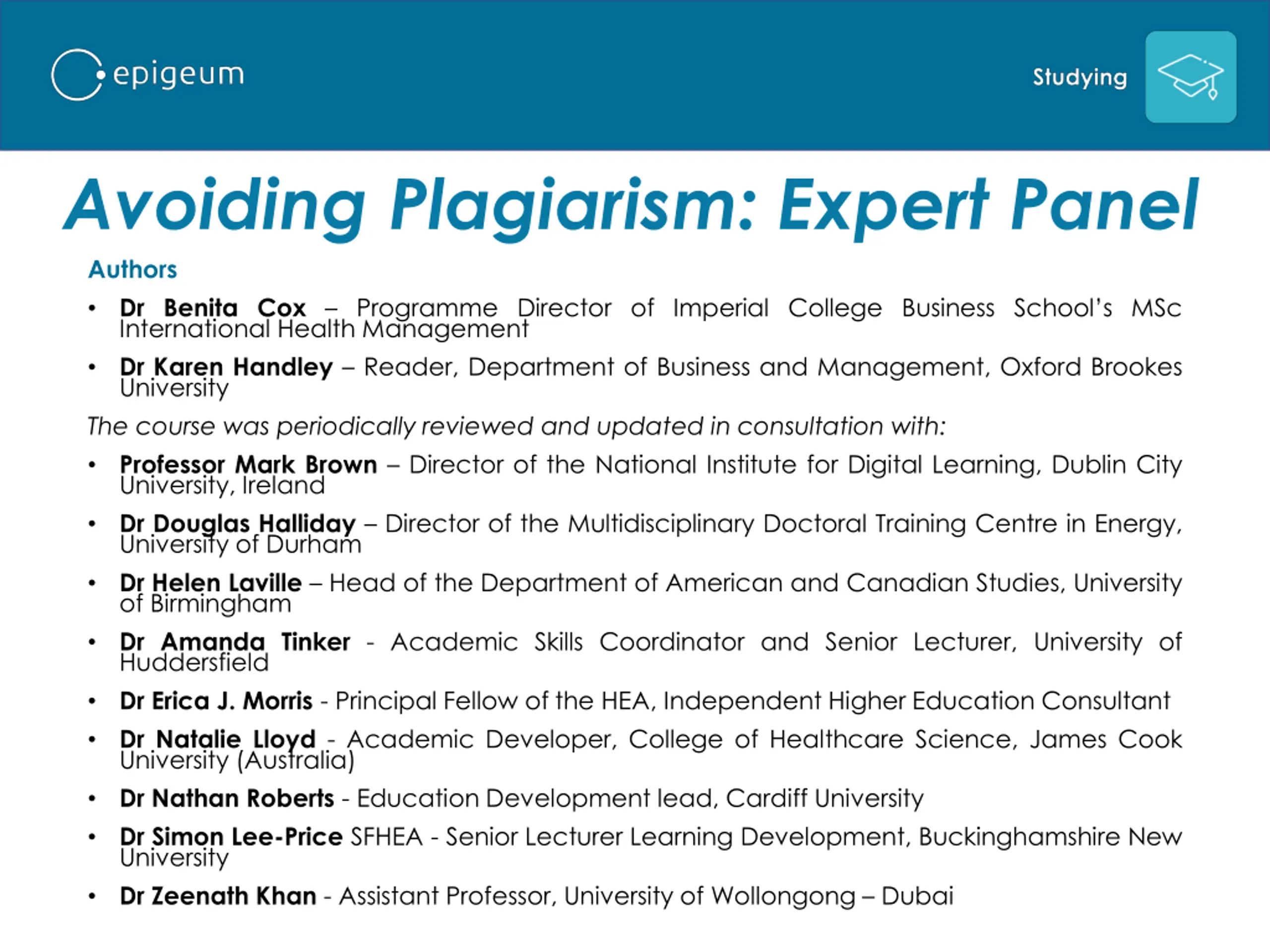 Avoiding Plagiarism: Expert Panel Authors Dr Benita Cox Programme Director of Imperial College Business School s MSc International Health Management Dr Karen Handley Reader, Department of Business and Management, Oxford Brookes University The course was periodically reviewed and updated in consultation with: Professor Mark Brown Director of the National Institute for Digital Learning, Dublin City University, Ireland Dr Douglas Halliday Director of the Multidisciplinary Doctoral Training Centre in Energy, University of Durham Dr Helen Laville Head of the Department of American and Canadian Studies, University of Birmingham Dr Amanda Tinker - Academic Skills Coordinator and Senior Lecturer, University of Huddersfield Dr Erica J. Morris - Principal Fellow of the HEA, Independent Higher Education Consultant Dr Natalie Lloyd - Academic Developer, College of Healthcare Science, James Cook University (Australia) Dr Nathan Roberts - Education Development lead, Cardiff University Dr Simon Lee-Price SFHEA - Senior Lecturer Learning Development, Buckinghamshire New University Dr Zeenath Khan - Assistant Professor, University of Wollongong Dubai