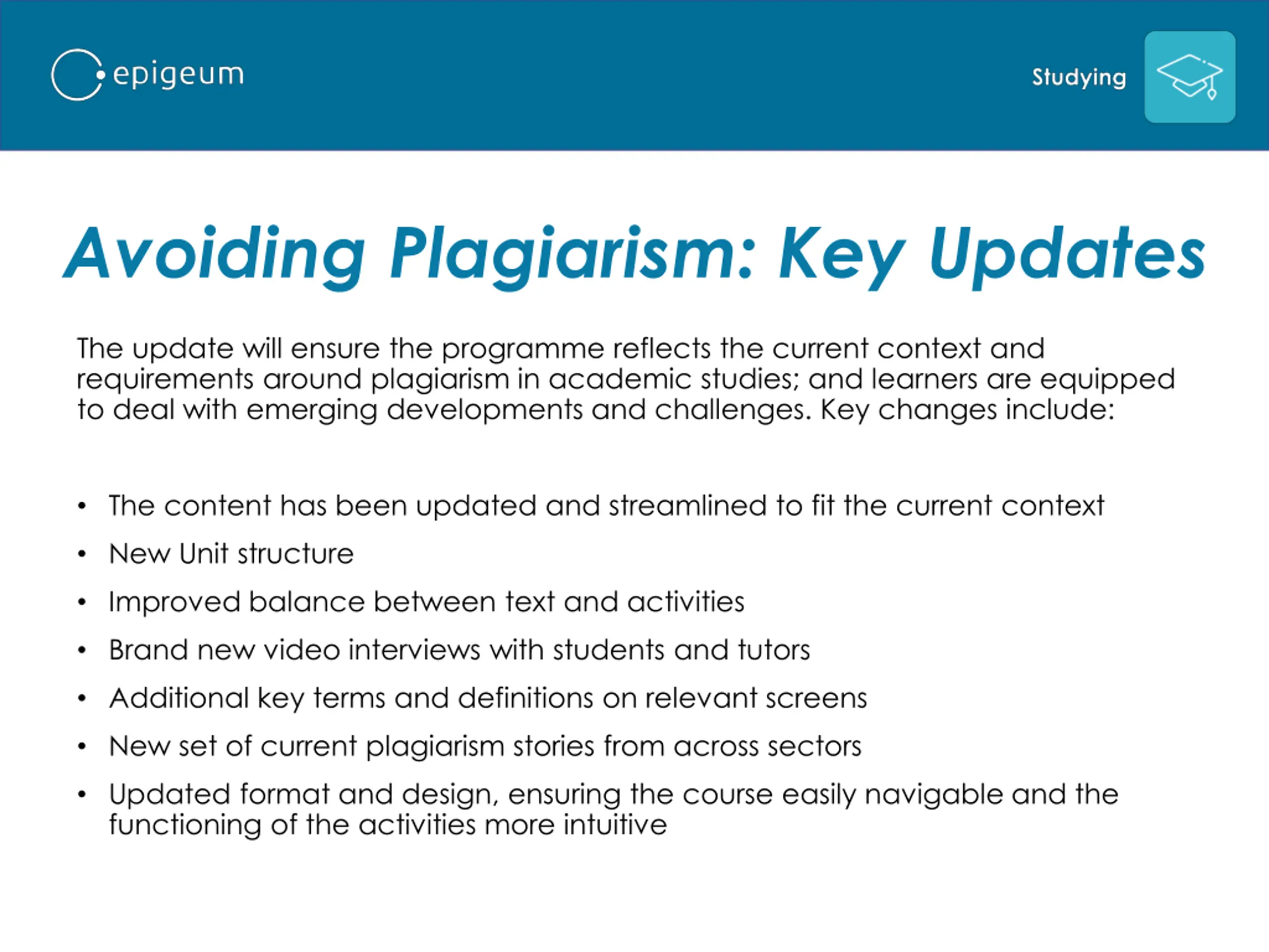 Avoiding Plagiarism: Key Updates The update will ensure the programme reflects the current context and requirements around plagiarism in academic studies; and learners are equipped to deal with emerging developments and challenges. Key changes include: The content has been updated and streamlined to fit the current context New Unit structure Improved balance between text and activities Brand new video interviews with students and tutors Additional key terms and definitions on relevant screens New set of current plagiarism stories from across sectors Updated format and design, ensuring the course easily navigable and the functioning of the activities more intuitive