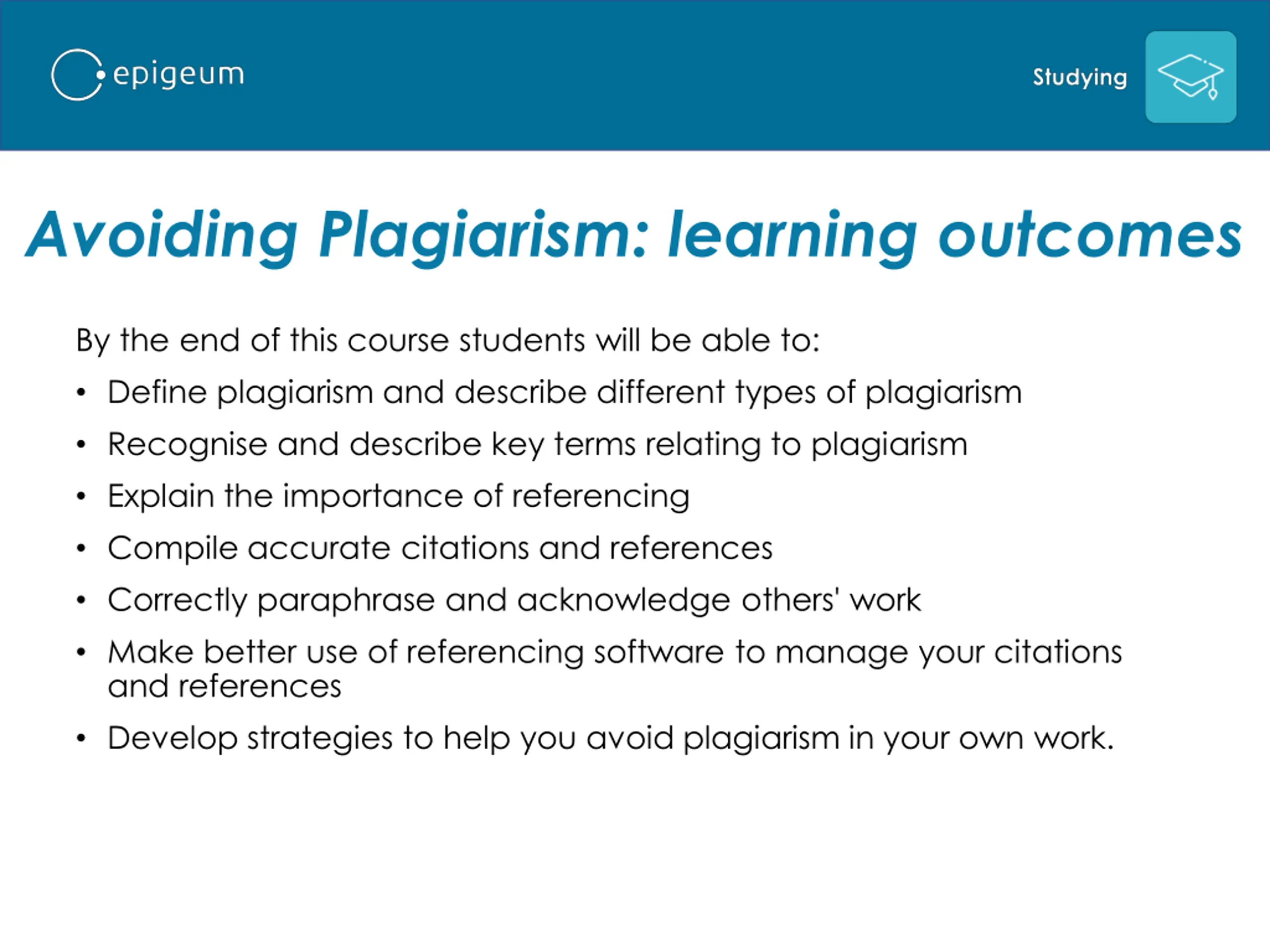 Avoiding Plagiarism: learning outcomes By the end of this course students will be able to: Define plagiarism and describe different types of plagiarism Recognise and describe key terms relating to plagiarism Explain the importance of referencing Compile accurate citations and references Correctly paraphrase and acknowledge others' work Make better use of referencing software to manage your citations and references Develop strategies to help you avoid plagiarism in your own work.