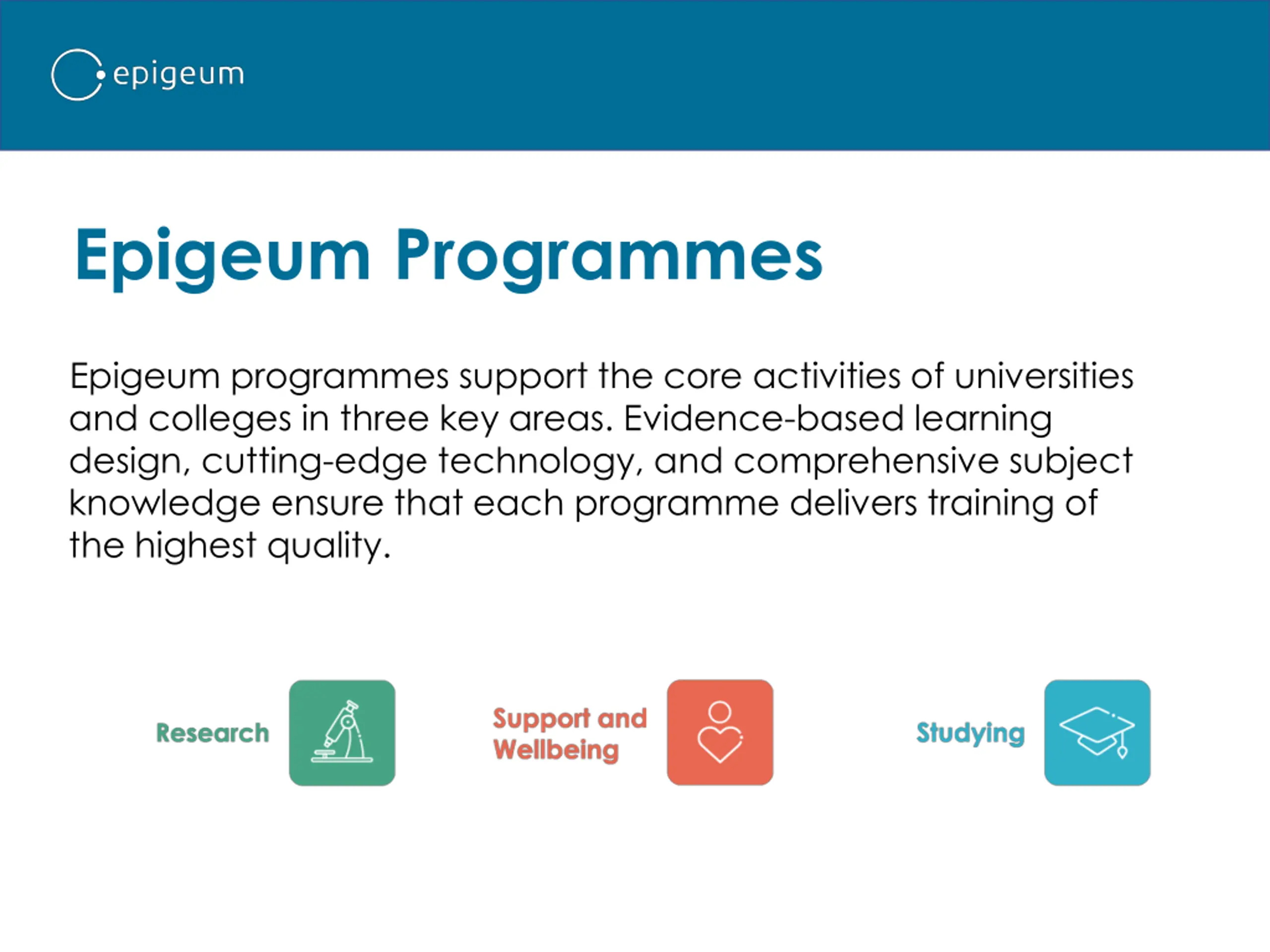 Epigeum Programmes Epigeum programmes support the core activities of universities and colleges in three key areas. Evidence-based learning design, cutting-edge technology, and comprehensive subject knowledge ensure that each programme delivers training of the highest quality.