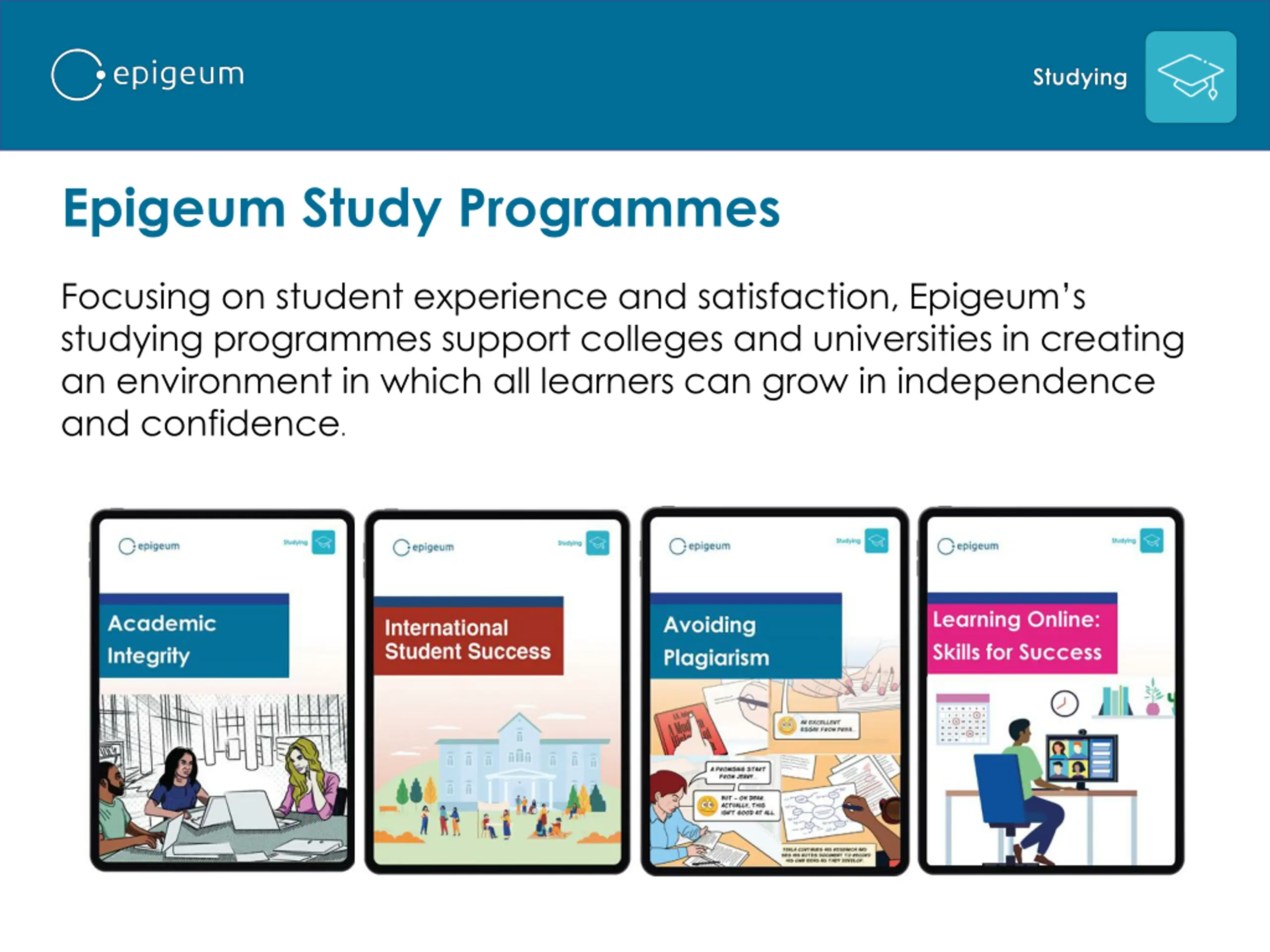 Epigeum Study Programmes Focusing on student experience and satisfaction, Epigeum s studying programmes support colleges and universities in creating an environment in which all learners can grow in independence and confidence.