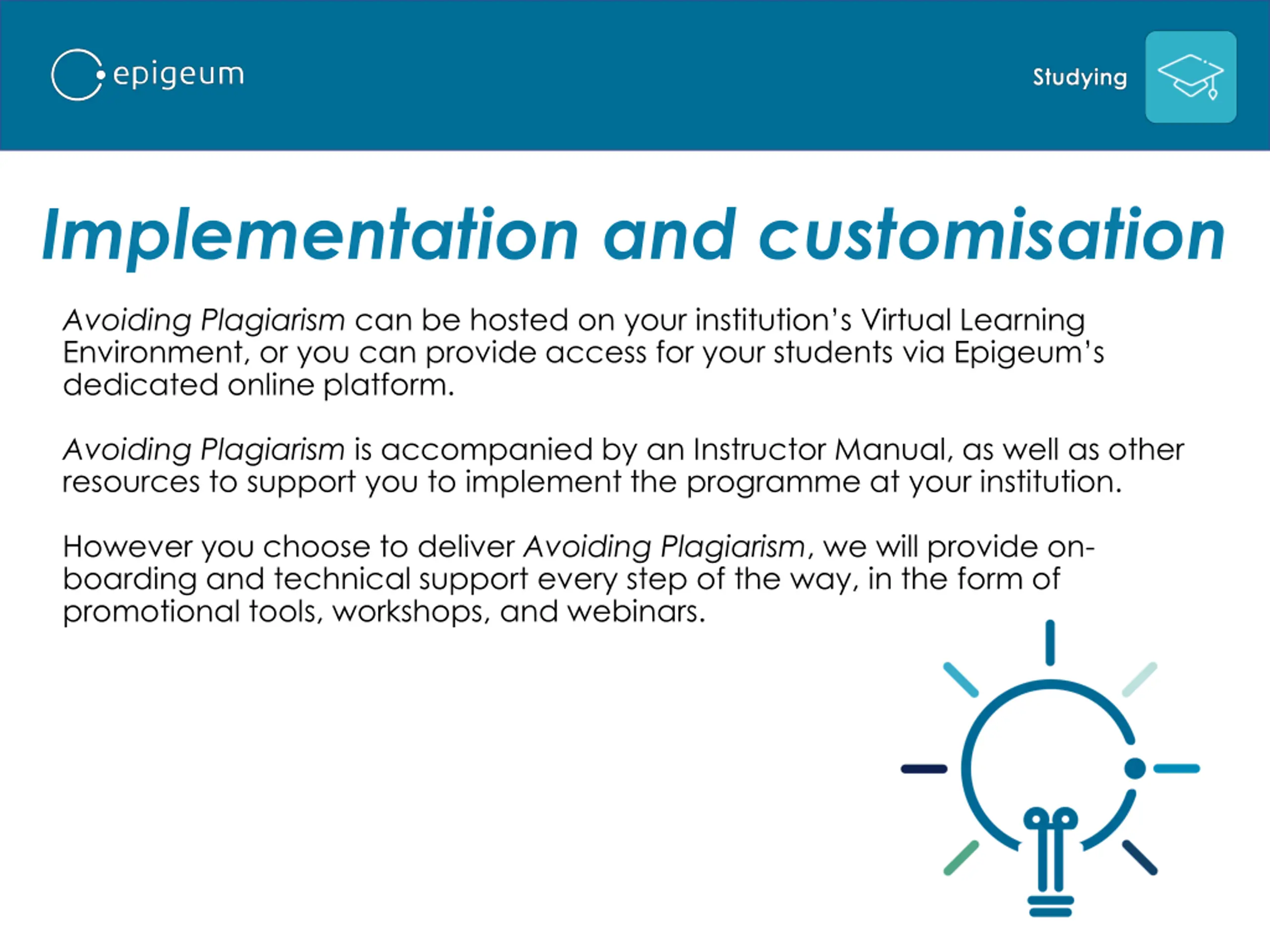 Implementation and customisation Avoiding Plagiarism can be hosted on your institution s Virtual Learning Environment, or you can provide access for your students via Epigeum s dedicated online platform. Avoiding Plagiarism is accompanied by an Instructor Manual, as well as other resources to support you to implement the programme at your institution. However you choose to deliver Avoiding Plagiarism, we will provide on- boarding and technical support every step of the way, in the form of promotional tools, workshops, and webinars.