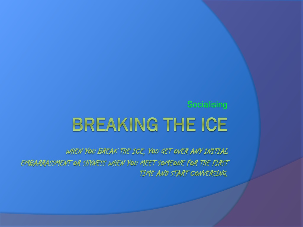 Socialising BREAKING THE ICE BREAKING THE ICE WHEN YOU BREAK THE ICE, YOU GET OVER ANY INITIAL EMBARRASSMENT OR SHYNESS WHEN YOU MEET SOMEONE FOR THE FIRST TIME AND START CONVERSING.