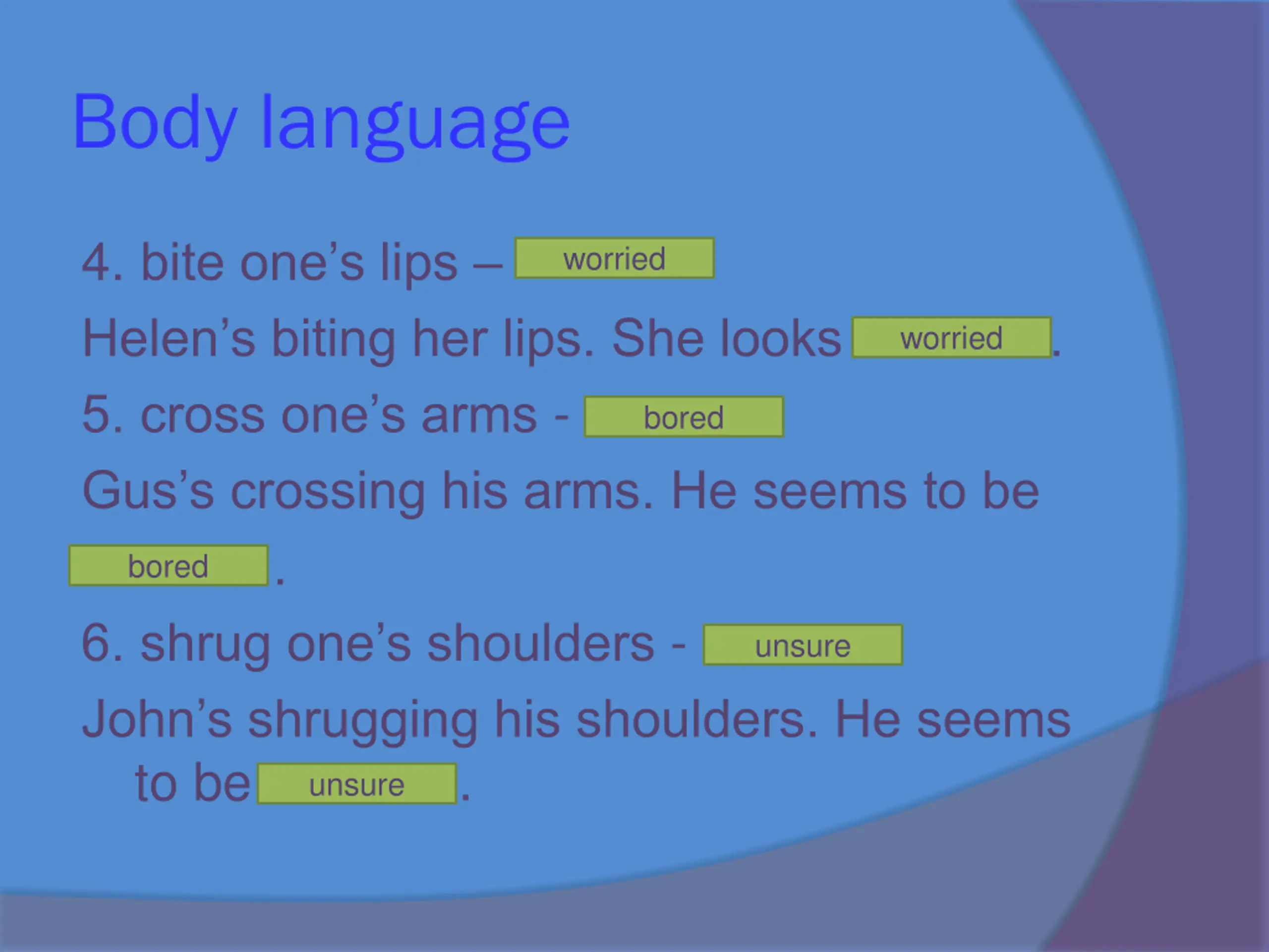 Body language 4. bite one s lips Helen s biting her lips. She looks . 5. cross one s arms - Gus s crossing his arms. He seems to be . 6. shrug one s shoulders - John s shrugging his shoulders. He seems to be . unsure worried worried bored bored unsure
