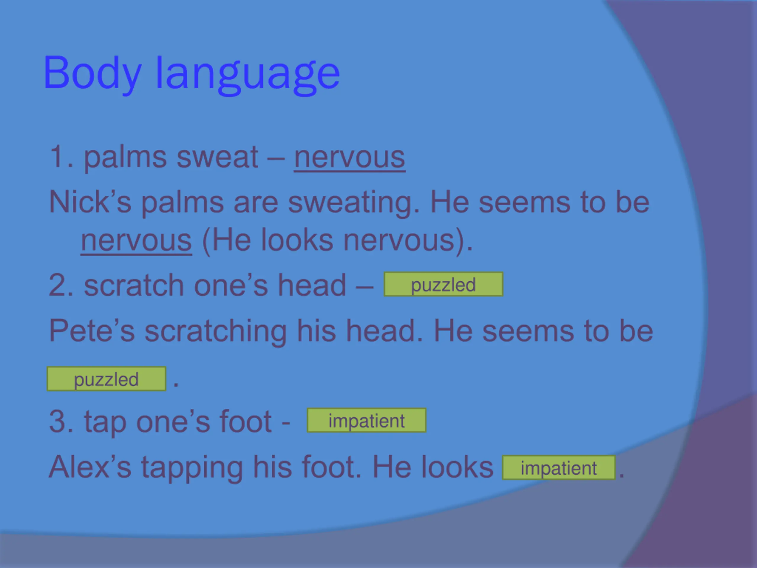 Body language 1. palms sweat nervous Nick s palms are sweating. He seems to be nervous (He looks nervous). 2. scratch one s head Pete s scratching his head. He seems to be . 3. tap one s foot - Alex s tapping his foot. He looks . puzzled puzzled impatient impatient