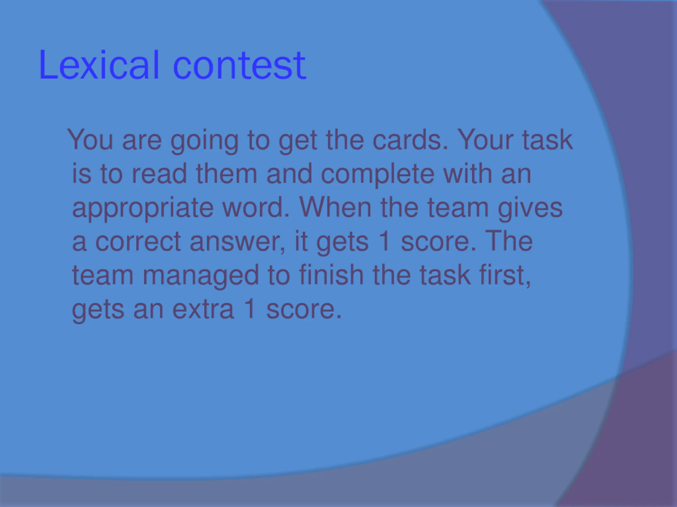 Lexical contest You are going to get the cards. Your task is to read them and complete with an appropriate word. When the team gives a correct answer, it gets 1 score. The team managed to finish the task first, gets an extra 1 score.