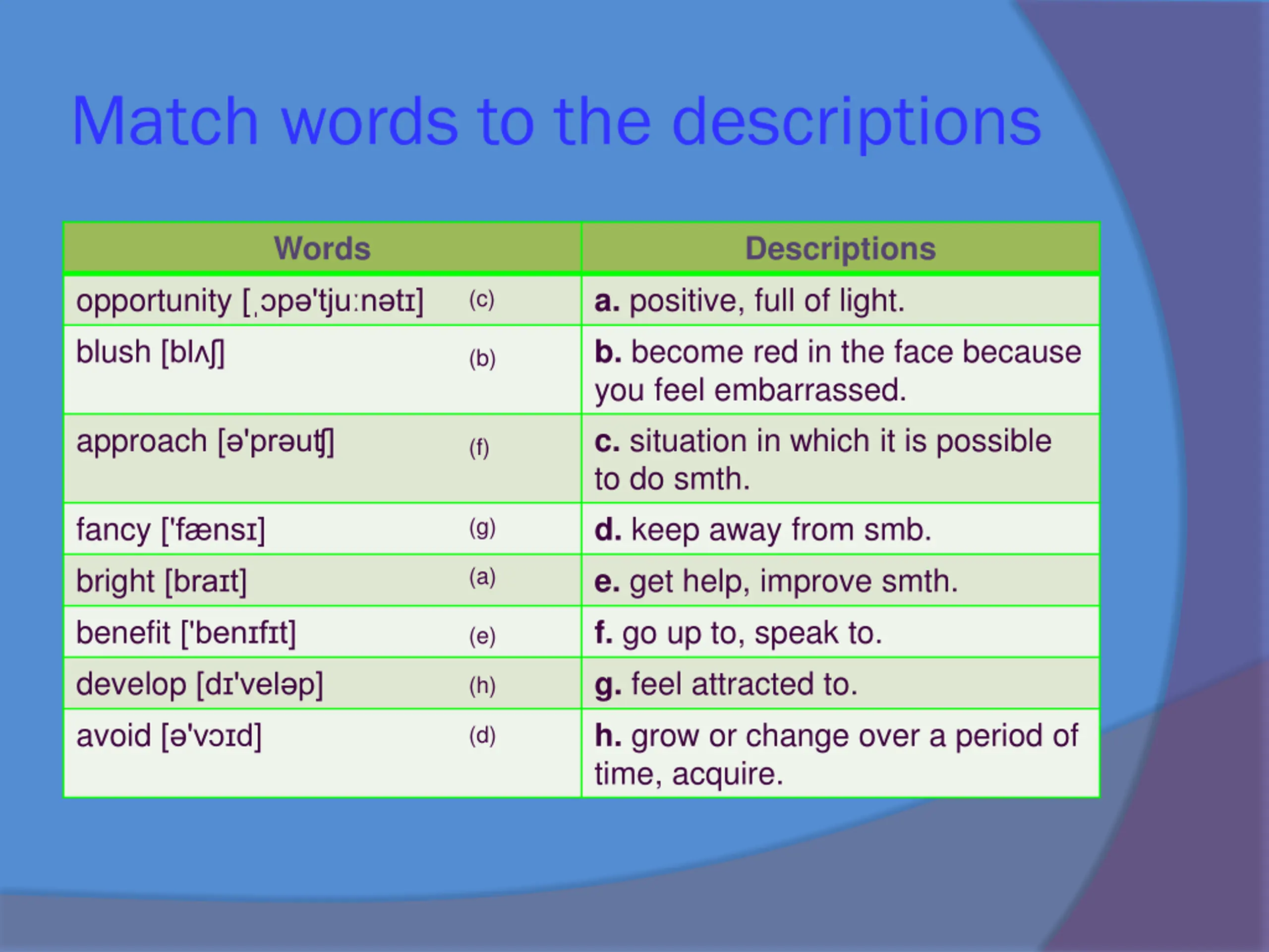 Match words to the descriptions Words Descriptions opportunity [ p 'tju n t ] blush [bl ] a. positive, full of light. b. become red in the face because you feel embarrassed. c. situation in which it is possible to do smth. d. keep away from smb. e. get help, improve smth. f. go up to, speak to. g. feel attracted to. h. grow or change over a period of time, acquire. (c) (b) approach [ 'pr u ] (f) fancy ['f ns ] bright [bra t] benefit ['ben f t] develop [d 'vel p] avoid [ 'v d] (g) (a) (e) (h) (d)