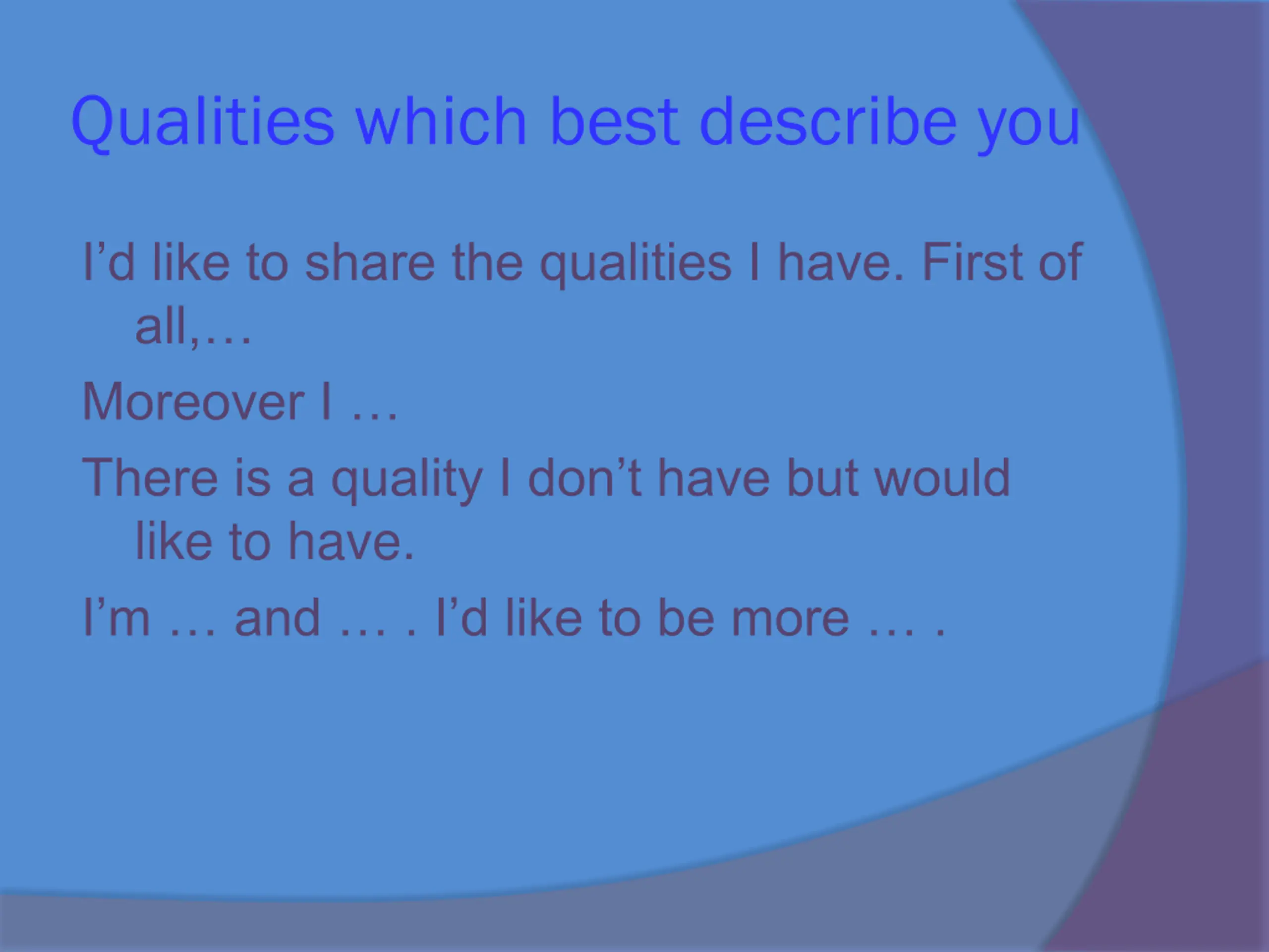 Qualities which best describe you I d like to share the qualities I have. First of all, Moreover I There is a quality I don t have but would like to have. I m and . I d like to be more .