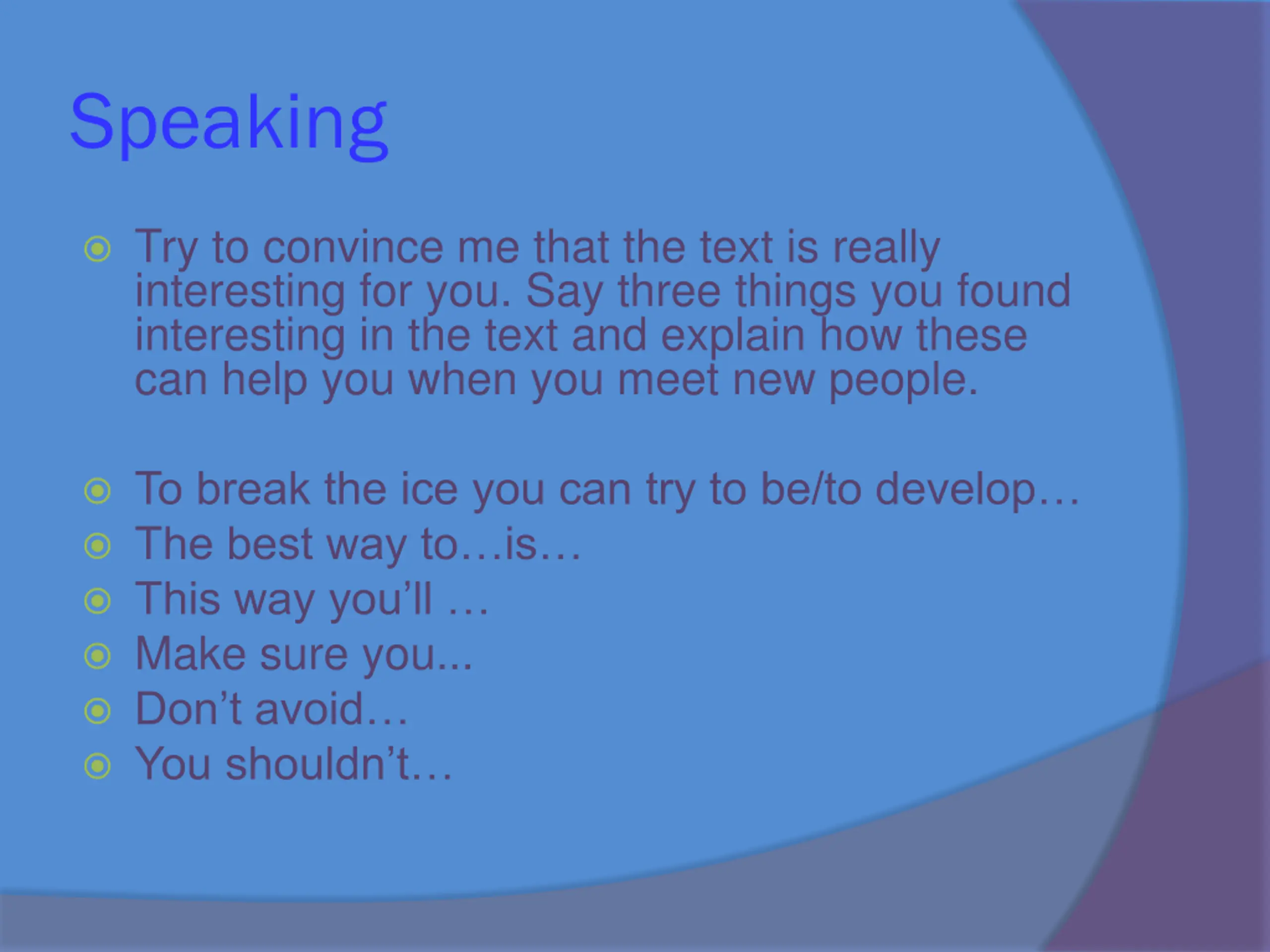 Speaking Try to convince me that the text is really interesting for you. Say three things you found interesting in the text and explain how these can help you when you meet new people. To break the ice you can try to be/to develop The best way to is This way you ll Make sure you... Don t avoid You shouldn t