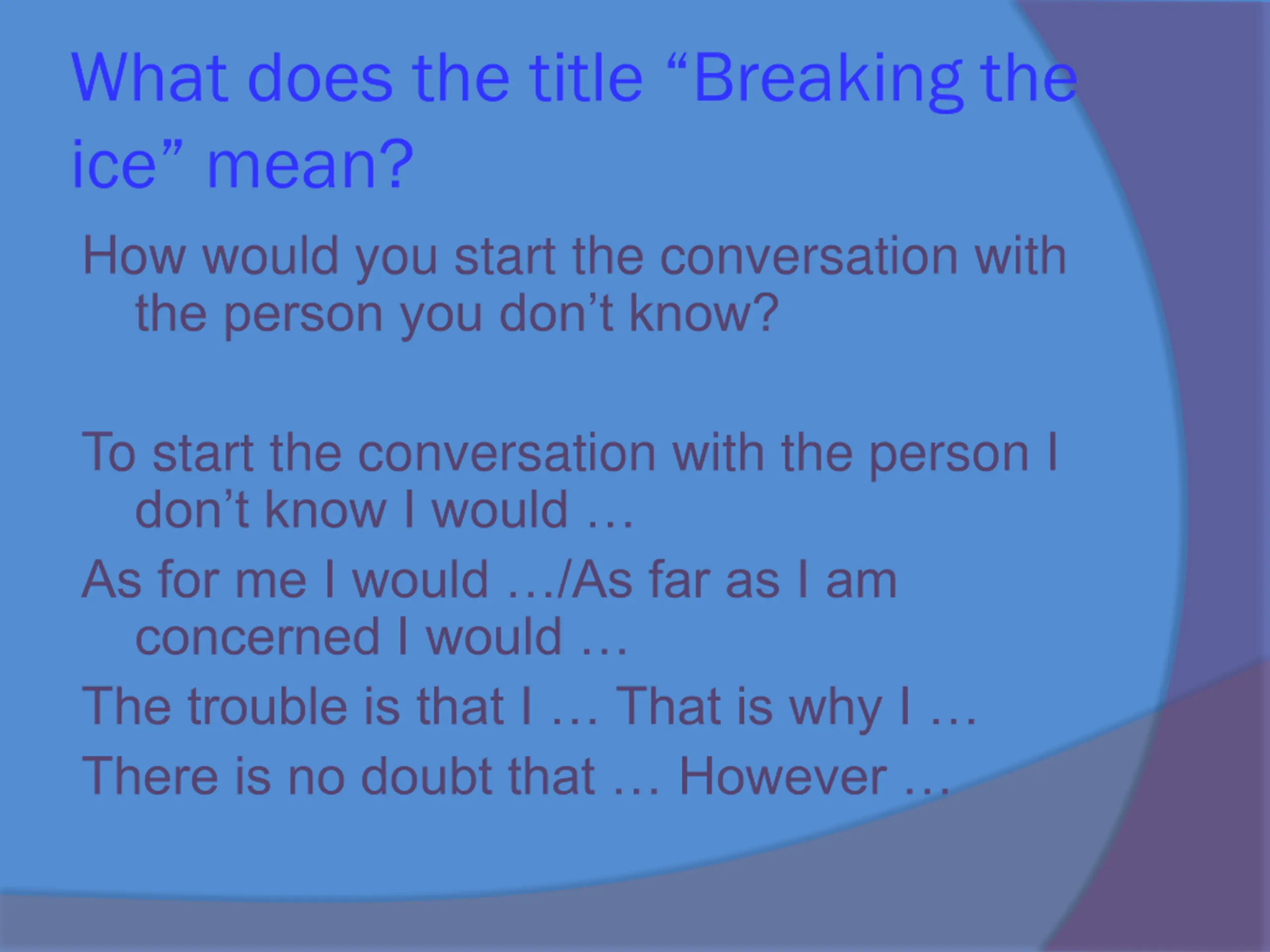 What does the title Breaking the ice mean? How would you start the conversation with the person you don t know? To start the conversation with the person I don t know I would As for me I would /As far as I am concerned I would The trouble is that I That is why I There is no doubt that However