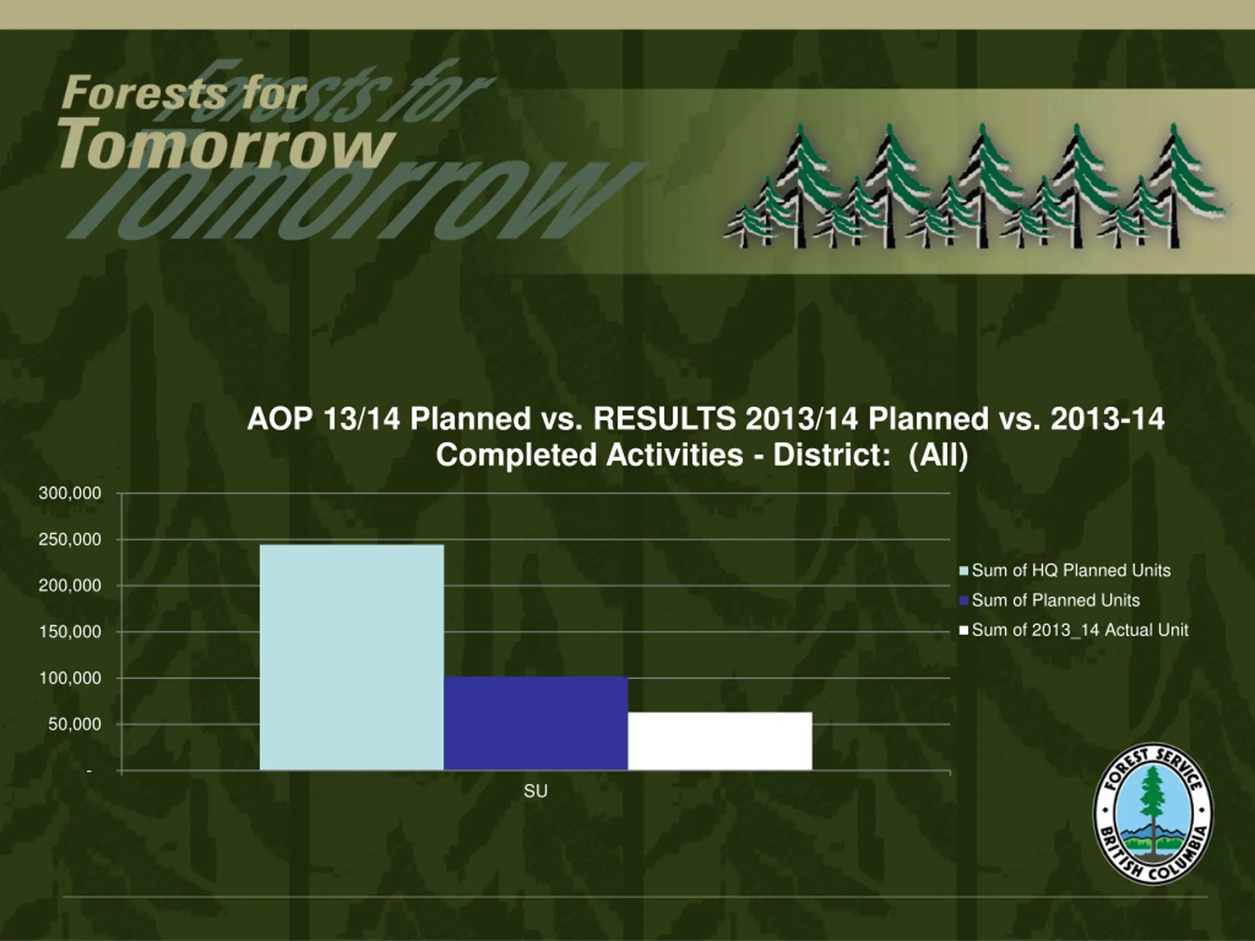 AOP 13/14 Planned vs. RESULTS 2013/14 Planned vs. 2013-14 Completed Activities - District: (All) 300,000 250,000 Sum of HQ Planned Units 200,000 Sum of Planned Units Sum of 2013_14 Actual Unit 150,000 100,000 50,000 - SU