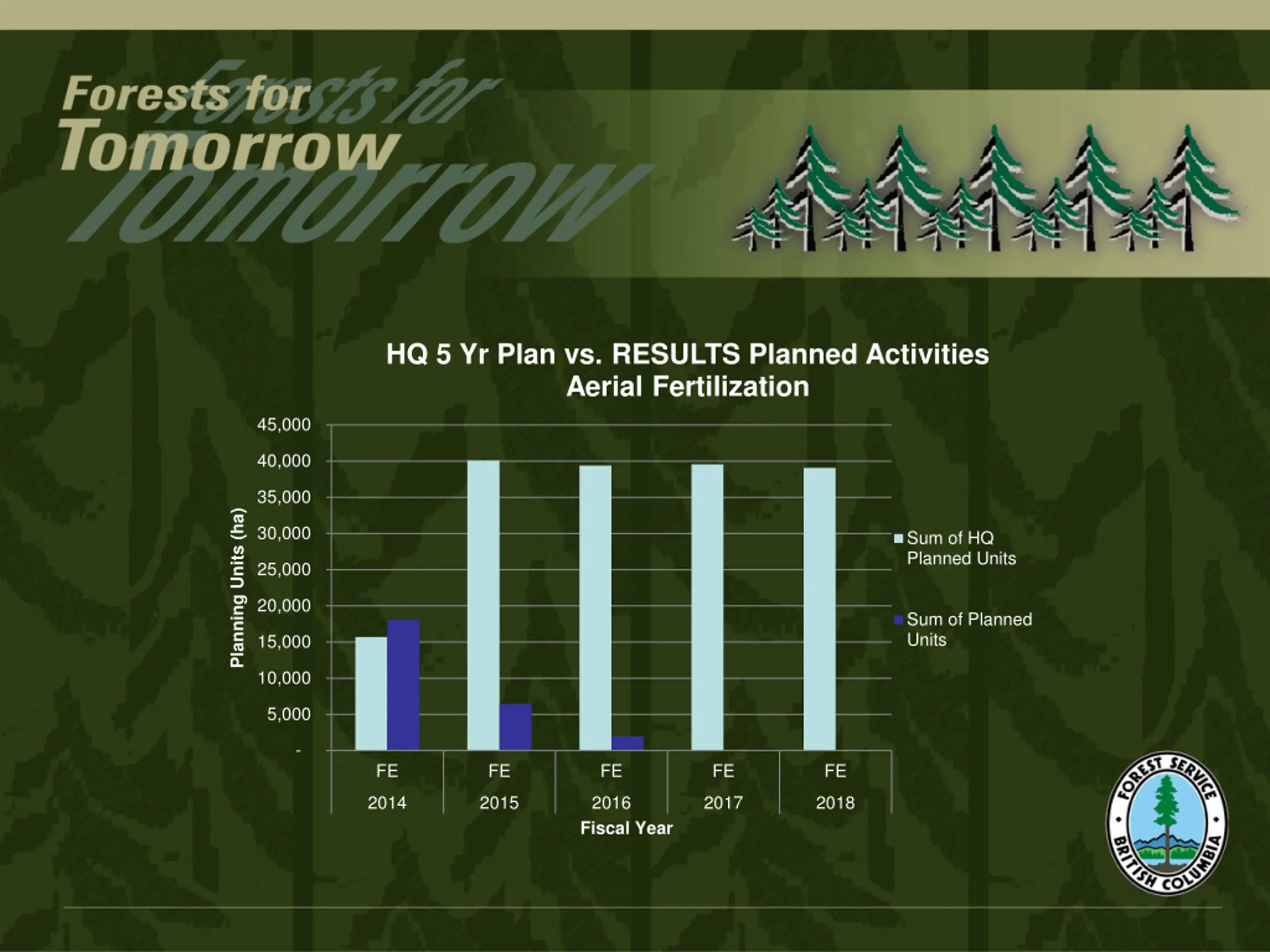 HQ 5 Yr Plan vs. RESULTS Planned Activities Aerial Fertilization 45,000 40,000 35,000 Planning Units (ha) 30,000 Sum of HQ Planned Units 25,000 20,000 Sum of Planned Units 15,000 10,000 5,000 - FE FE FE FE FE 2014 2015 2016 Fiscal Year 2017 2018