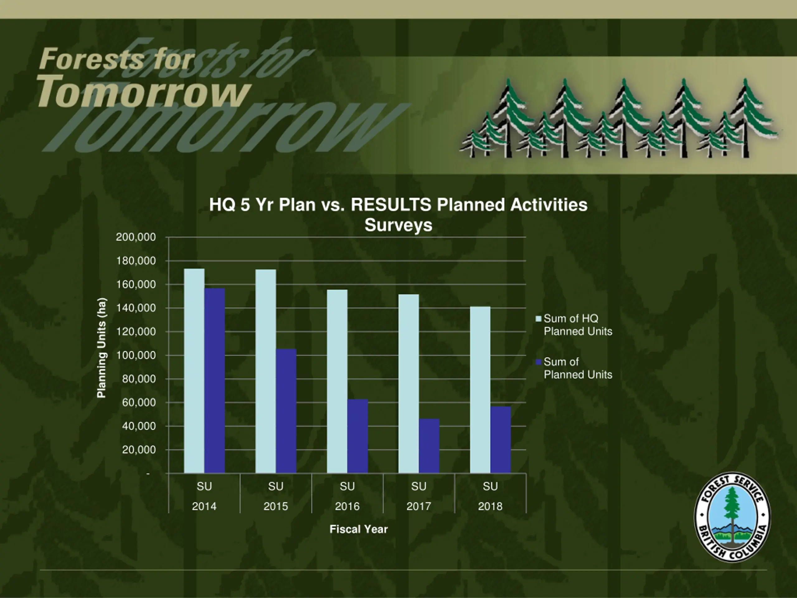 HQ 5 Yr Plan vs. RESULTS Planned Activities Surveys 200,000 180,000 160,000 Planning Units (ha) 140,000 Sum of HQ Planned Units 120,000 100,000 Sum of Planned Units 80,000 60,000 40,000 20,000 - SU SU SU SU SU 2014 2015 2016 2017 2018 Fiscal Year