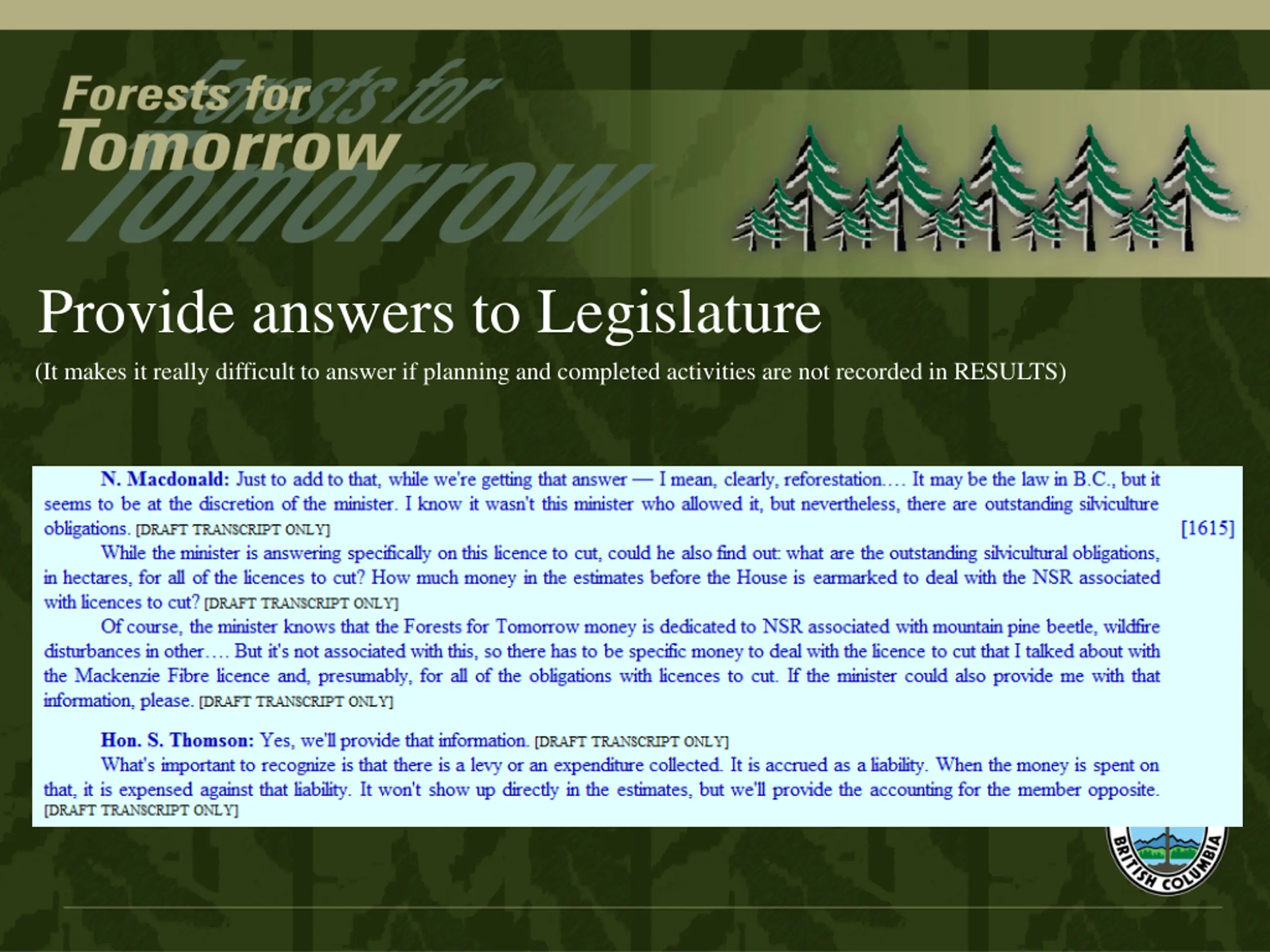 Provide answers to Legislature (It makes it really difficult to answer if planning and completed activities are not recorded in RESULTS)
