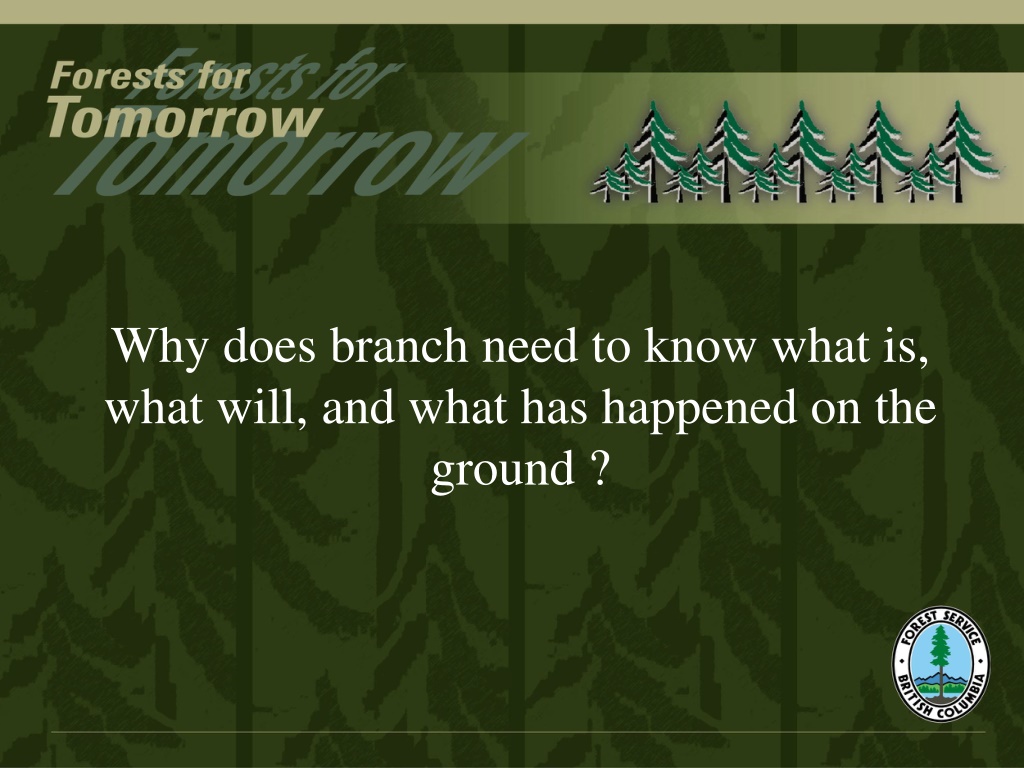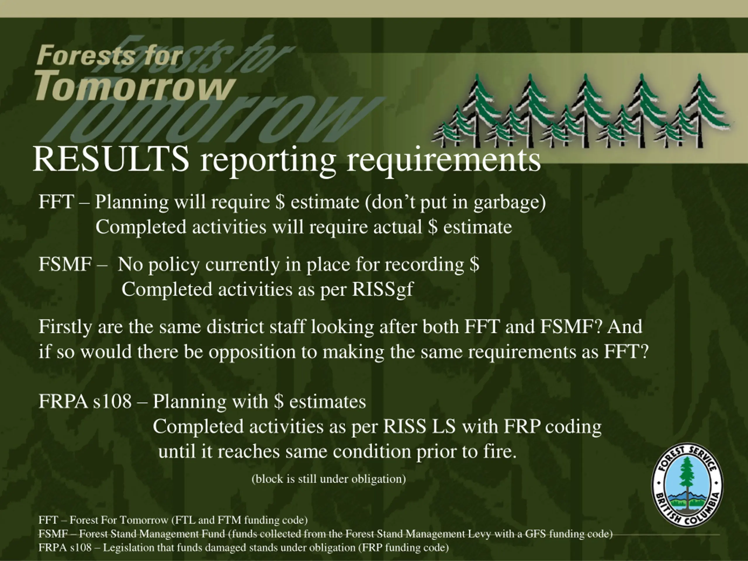 RESULTS reporting requirements FFT Planning will require $ estimate (don t put in garbage) Completed activities will require actual $ estimate FSMF No policy currently in place for recording $ Completed activities as per RISSgf Firstly are the same district staff looking after both FFT and FSMF? And if so would there be opposition to making the same requirements as FFT? FRPA s108 Planning with $ estimates Completed activities as per RISS LS with FRP coding until it reaches same condition prior to fire. (block is still under obligation) FFT Forest For Tomorrow (FTL and FTM funding code) FSMF Forest Stand Management Fund (funds collected from the Forest Stand Management Levy with a GFS funding code) FRPA s108 Legislation that funds damaged stands under obligation (FRP funding code)