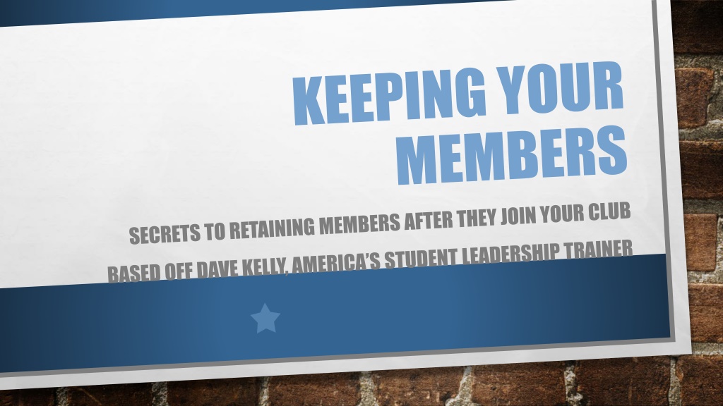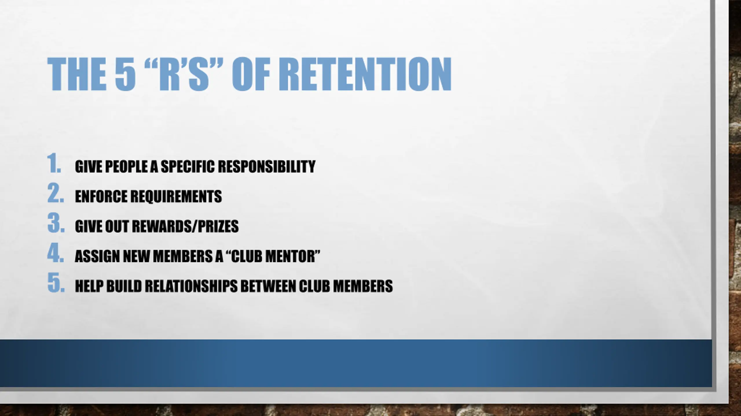 THE 5 RS OF RETENTION 1. GIVE PEOPLE A SPECIFIC RESPONSIBILITY 2. ENFORCE REQUIREMENTS 3. GIVE OUT REWARDS/PRIZES 4. ASSIGN NEW MEMBERS A CLUB MENTOR 5. HELP BUILD RELATIONSHIPS BETWEEN CLUB MEMBERS