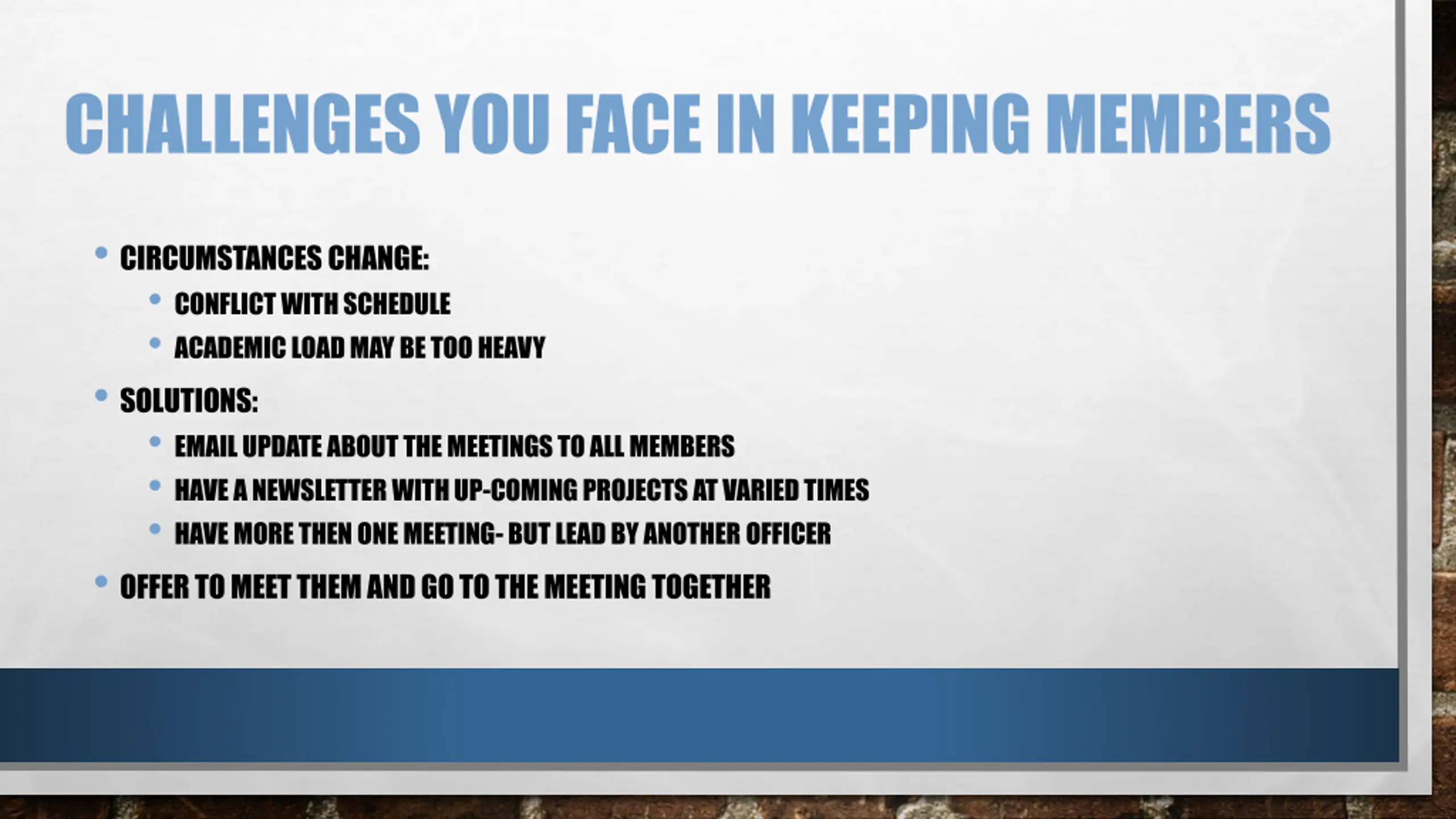 CHALLENGES YOU FACE IN KEEPING MEMBERS CIRCUMSTANCES CHANGE: CONFLICT WITH SCHEDULE ACADEMIC LOAD MAY BE TOO HEAVY SOLUTIONS: EMAIL UPDATE ABOUT THE MEETINGS TO ALL MEMBERS HAVE A NEWSLETTER WITH UP-COMING PROJECTS AT VARIED TIMES HAVE MORE THEN ONE MEETING-BUT LEAD BY ANOTHER OFFICER OFFER TO MEET THEM AND GO TO THE MEETING TOGETHER