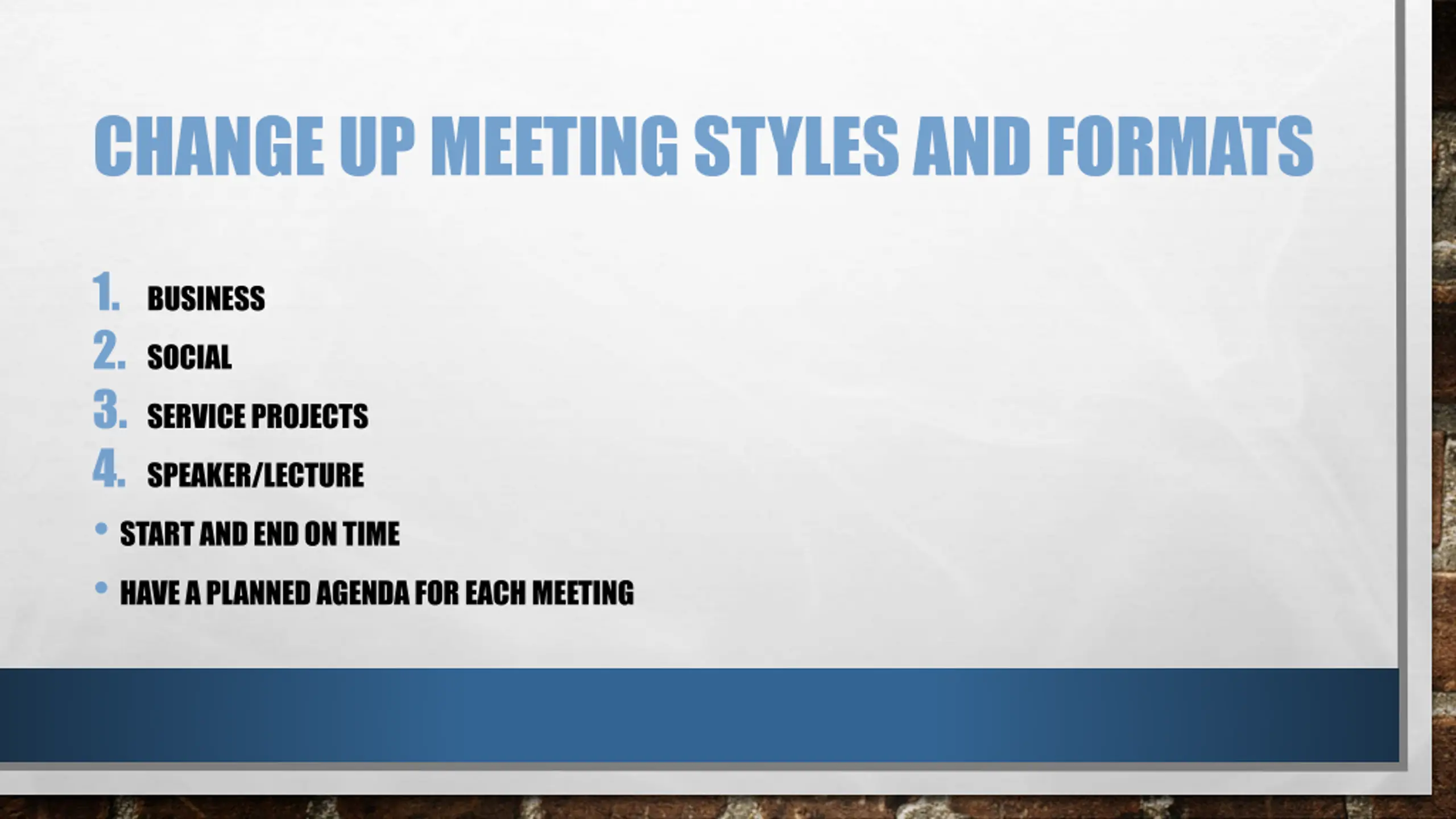 CHANGE UP MEETING STYLES AND FORMATS 1. BUSINESS 2. SOCIAL 3. SERVICE PROJECTS 4. SPEAKER/LECTURE START AND END ON TIME HAVE A PLANNED AGENDA FOR EACH MEETING