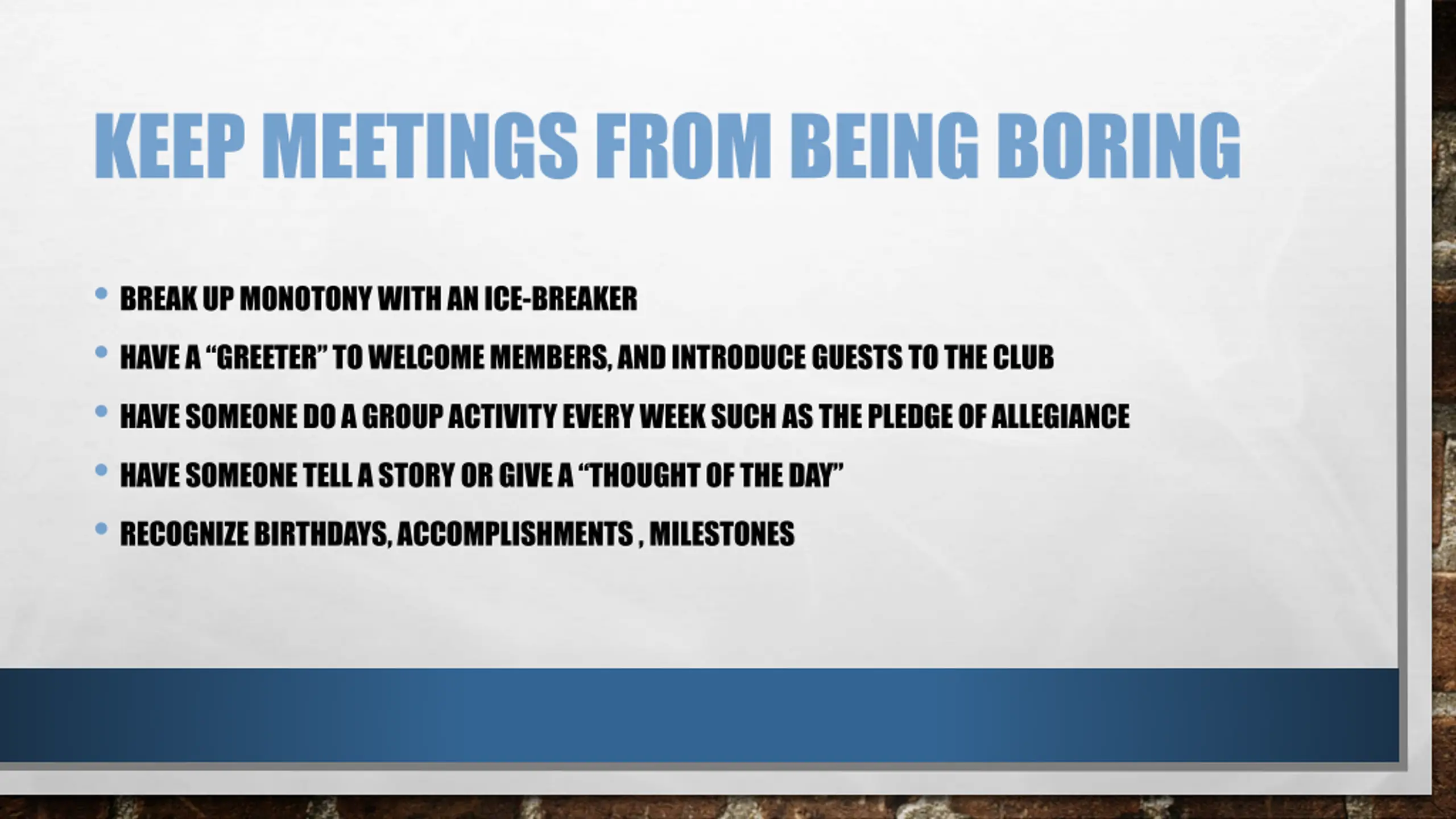 KEEP MEETINGS FROM BEING BORING BREAK UP MONOTONY WITH AN ICE-BREAKER HAVE A GREETER TO WELCOME MEMBERS, AND INTRODUCE GUESTS TO THECLUB HAVE SOMEONE DO A GROUP ACTIVITY EVERY WEEK SUCH AS THE PLEDGE OF ALLEGIANCE HAVE SOMEONE TELL A STORY OR GIVE A THOUGHT OF THE DAY RECOGNIZE BIRTHDAYS, ACCOMPLISHMENTS , MILESTONES