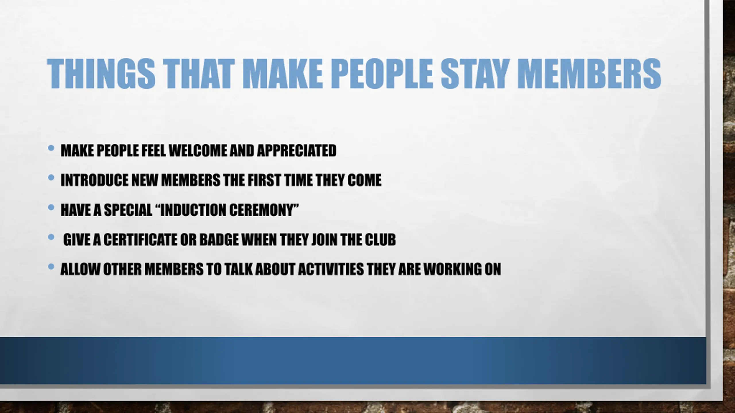 THINGS THAT MAKE PEOPLE STAY MEMBERS MAKE PEOPLE FEEL WELCOME AND APPRECIATED INTRODUCE NEW MEMBERS THE FIRST TIME THEY COME HAVE A SPECIAL INDUCTION CEREMONY GIVE A CERTIFICATE OR BADGE WHEN THEY JOIN THE CLUB ALLOW OTHER MEMBERS TO TALK ABOUT ACTIVITIES THEY ARE WORKING ON