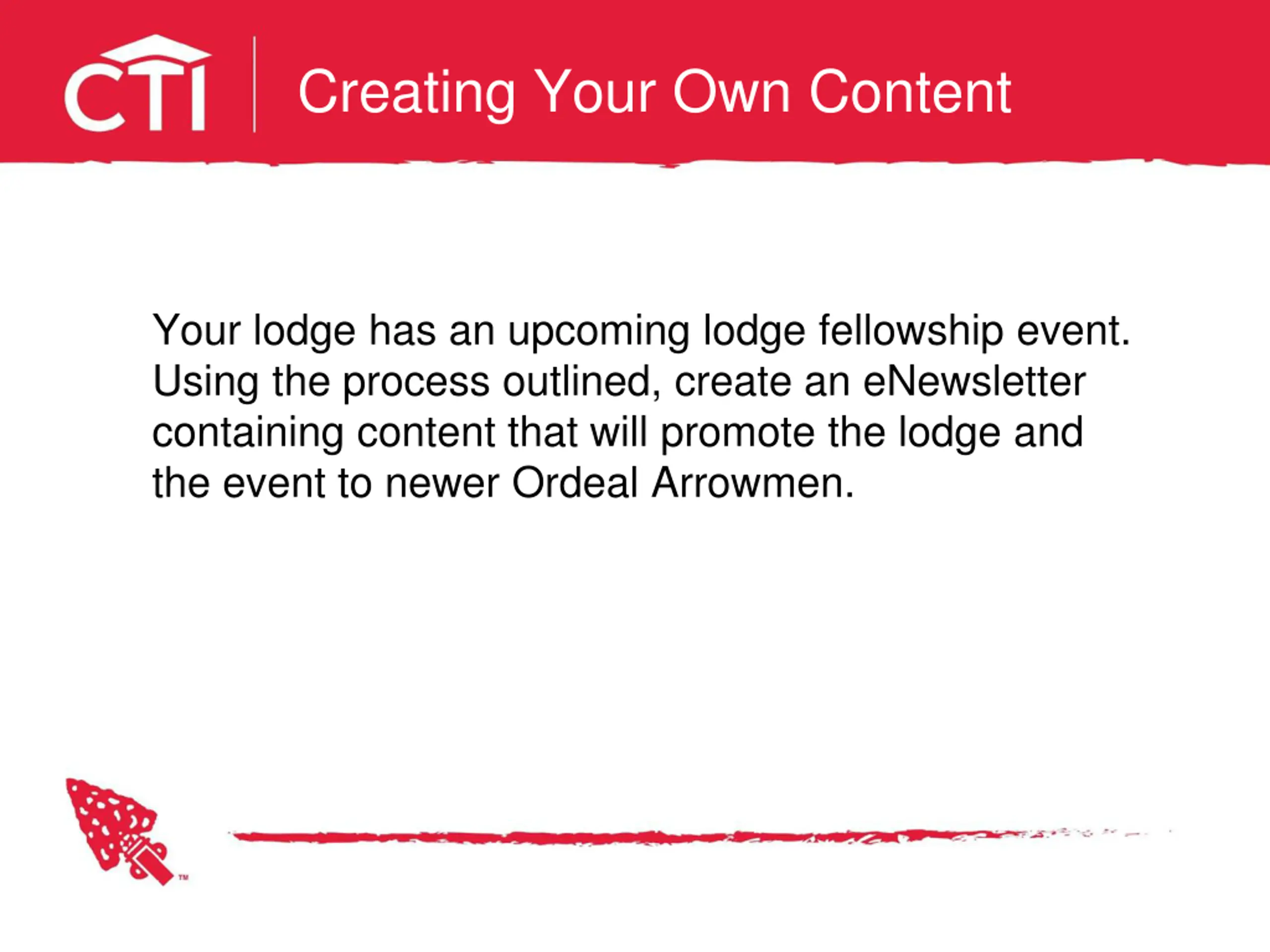 Creating Your Own Content Your lodge has an upcoming lodge fellowship event. Using the process outlined, create an eNewsletter containing content that will promote the lodge and the event to newer Ordeal Arrowmen.