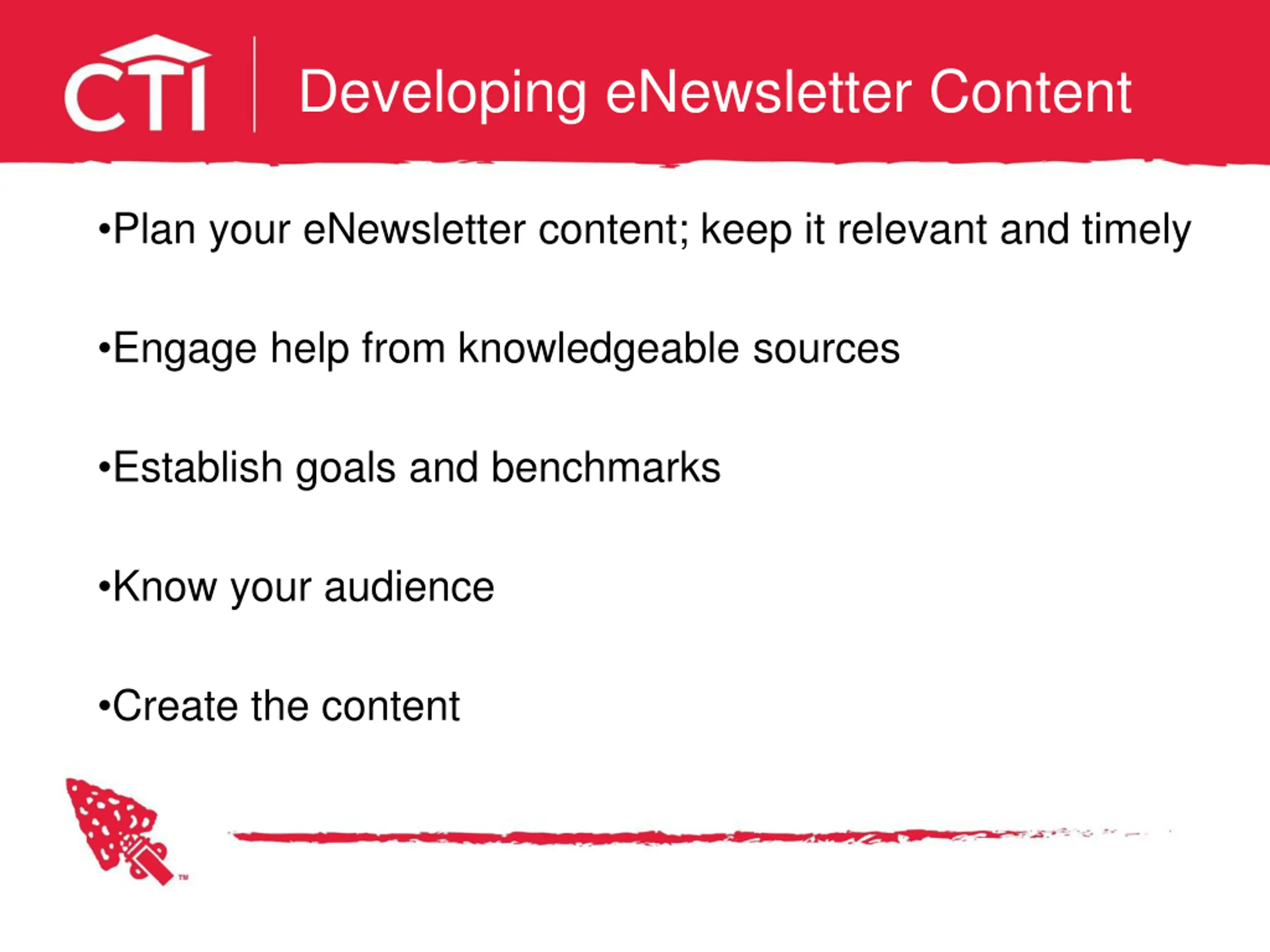 Developing eNewsletter Content Plan your eNewsletter content; keep it relevant and timely Engage help from knowledgeable sources Establish goals and benchmarks Know your audience Create the content