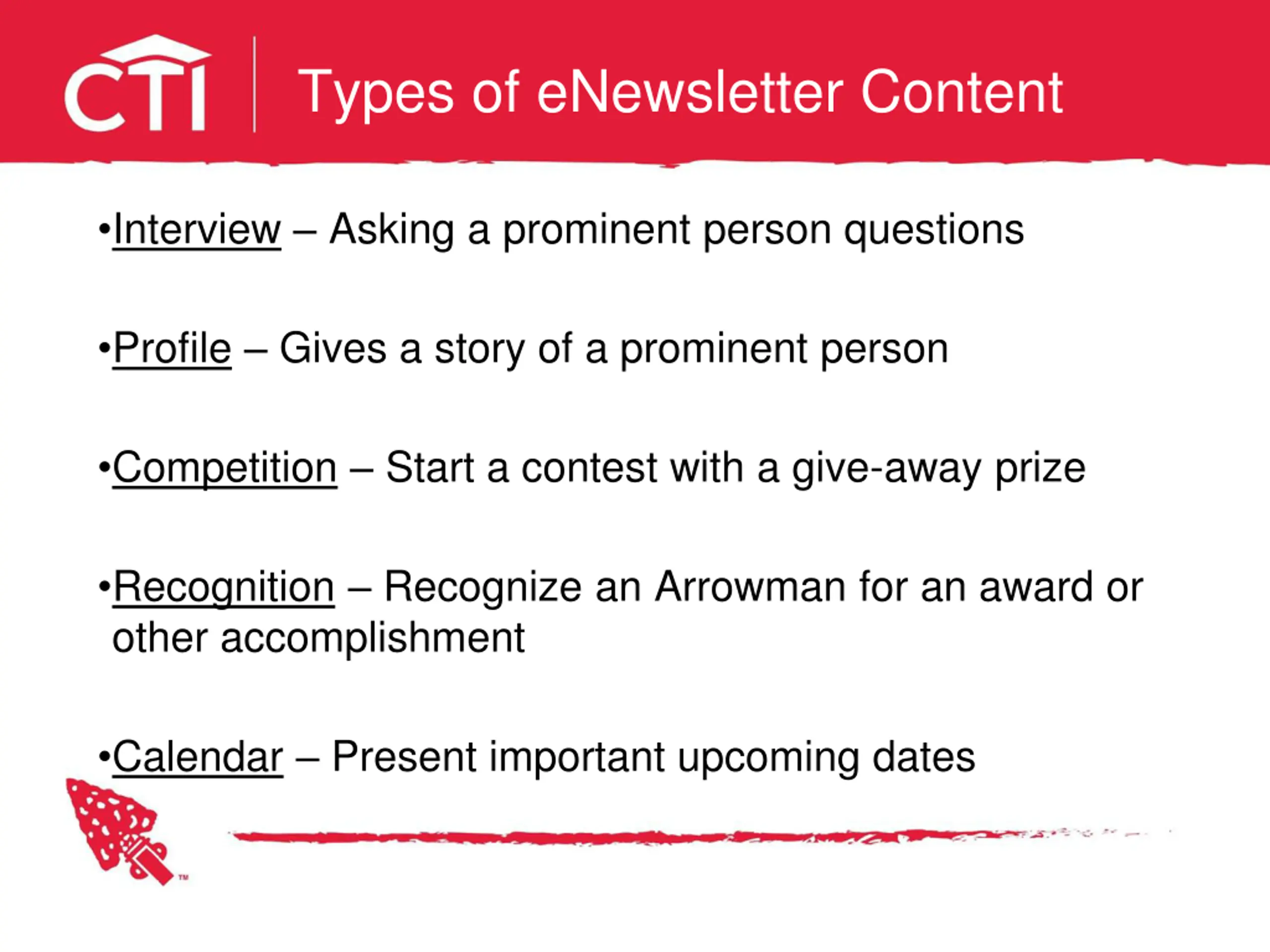 Types of eNewsletter Content Interview Asking a prominent person questions Profile Gives a story of a prominent person Competition Start a contest with a give-away prize Recognition Recognize an Arrowman for an award or other accomplishment Calendar Present important upcoming dates