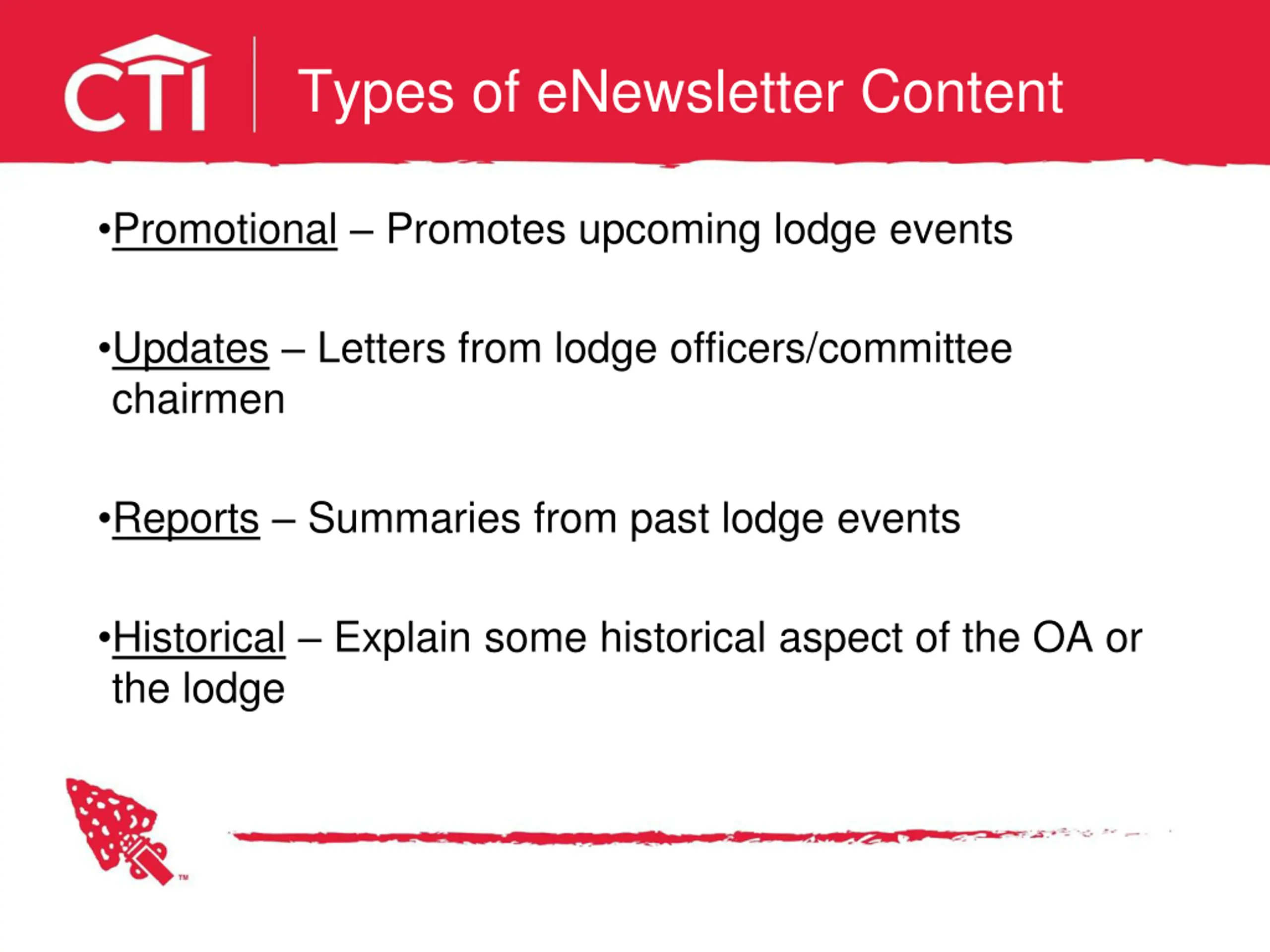 Types of eNewsletter Content Promotional Promotes upcoming lodge events Updates Letters from lodge officers/committee chairmen Reports Summaries from past lodge events Historical Explain some historical aspect of the OA or the lodge