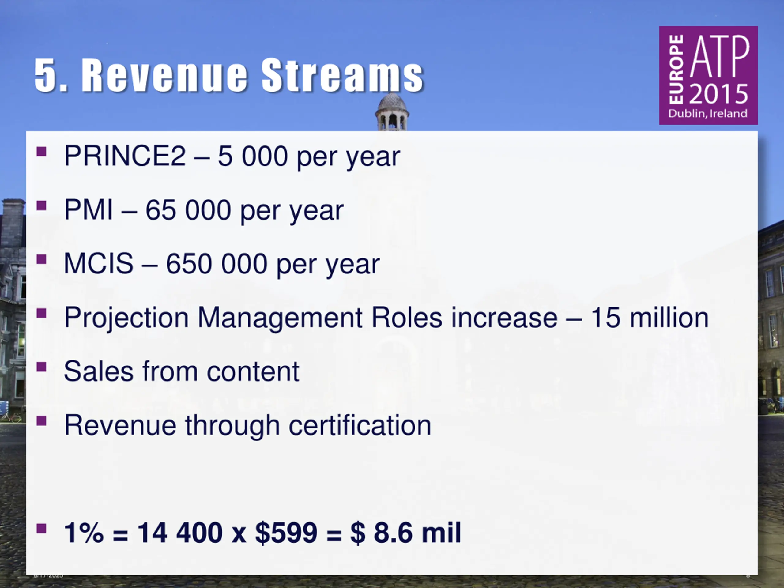 5. Revenue Streams PRINCE2 5 000 per year PMI 65 000 per year MCIS 650 000 per year Projection Management Roles increase 15 million Sales from content Revenue through certification 1% = 14 400 x $599 = $ 8.6 mil 6/17/2025 8