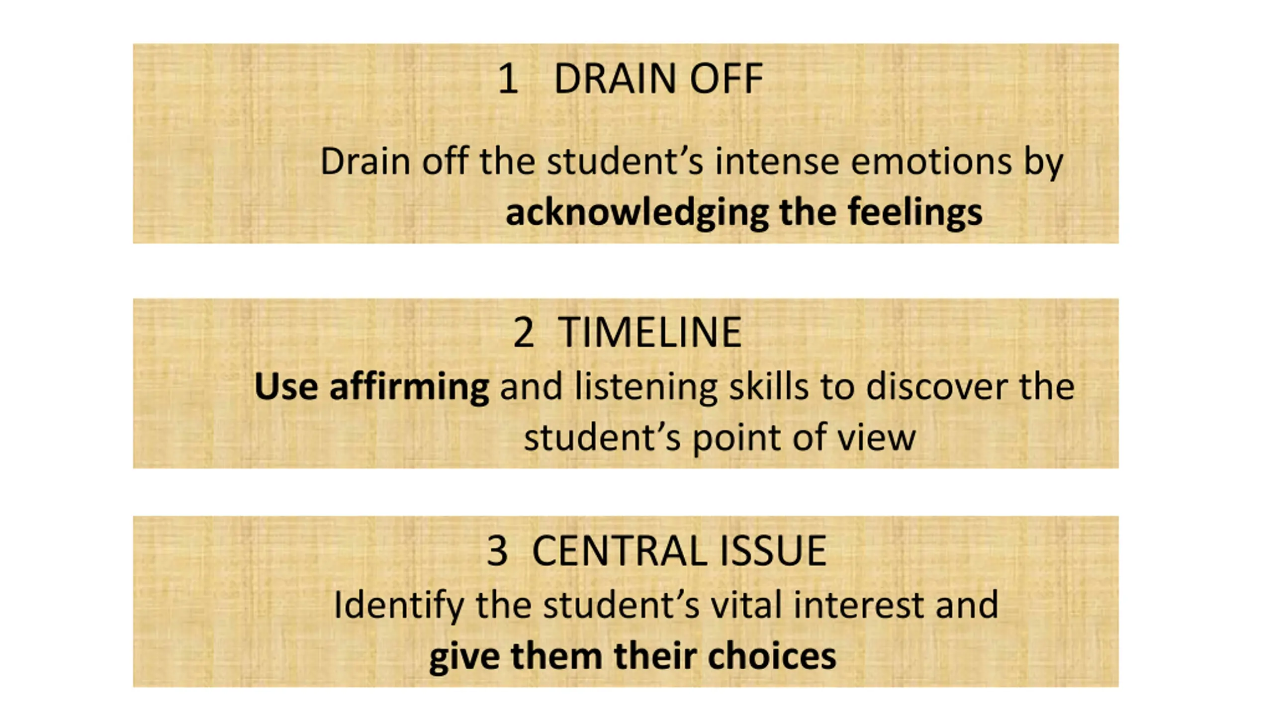 1 DRAIN OFF Drain off the student s intense emotions by acknowledging the feelings 2 TIMELINE Use affirming and listening skills to discover the student s point of view 3 CENTRAL ISSUE Identify the student s vital interest and give them their choices