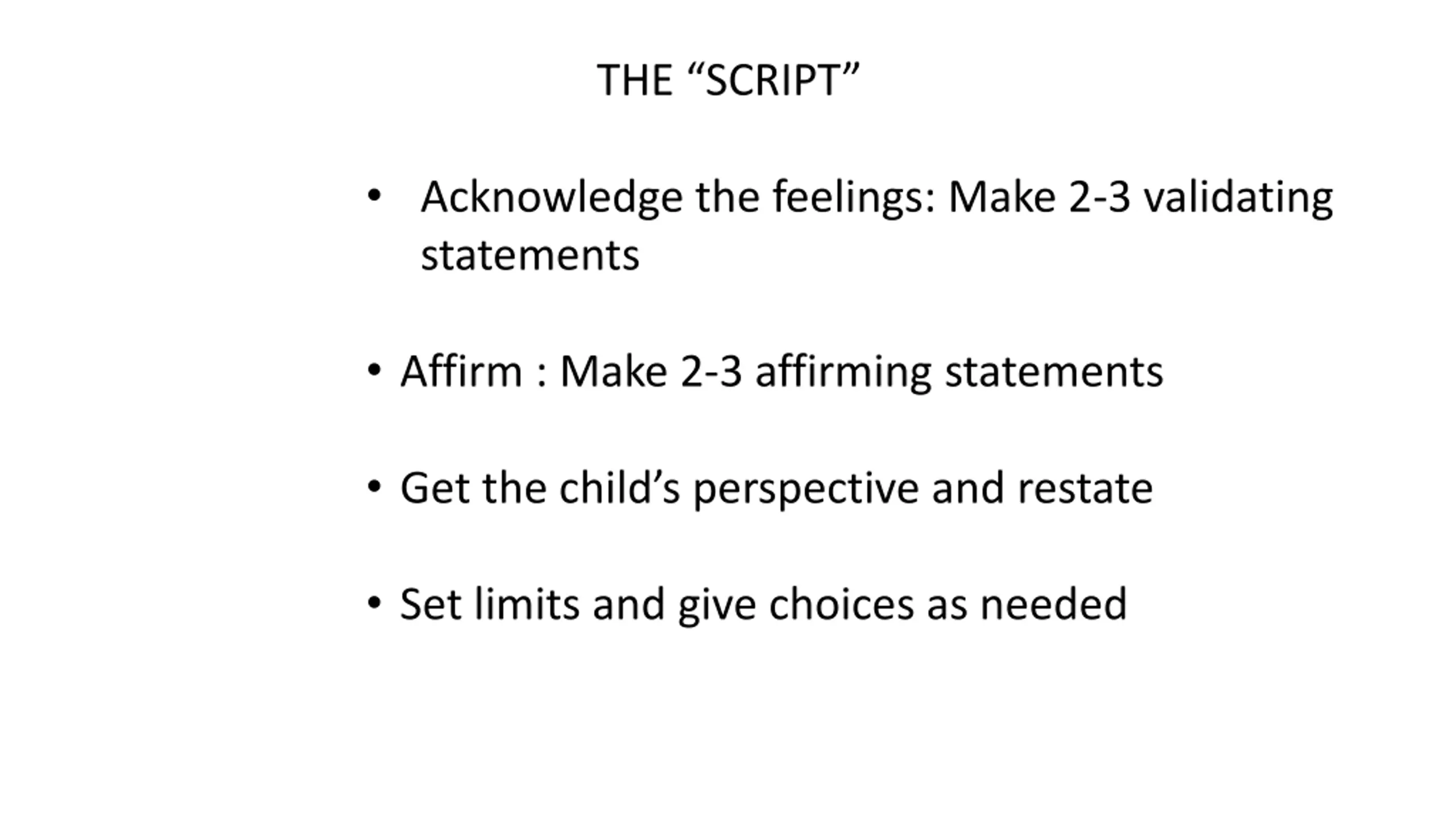 THE SCRIPT Acknowledge the feelings: Make 2-3 validating statements Affirm : Make 2-3 affirming statements Get the child s perspective and restate Set limits and give choices as needed