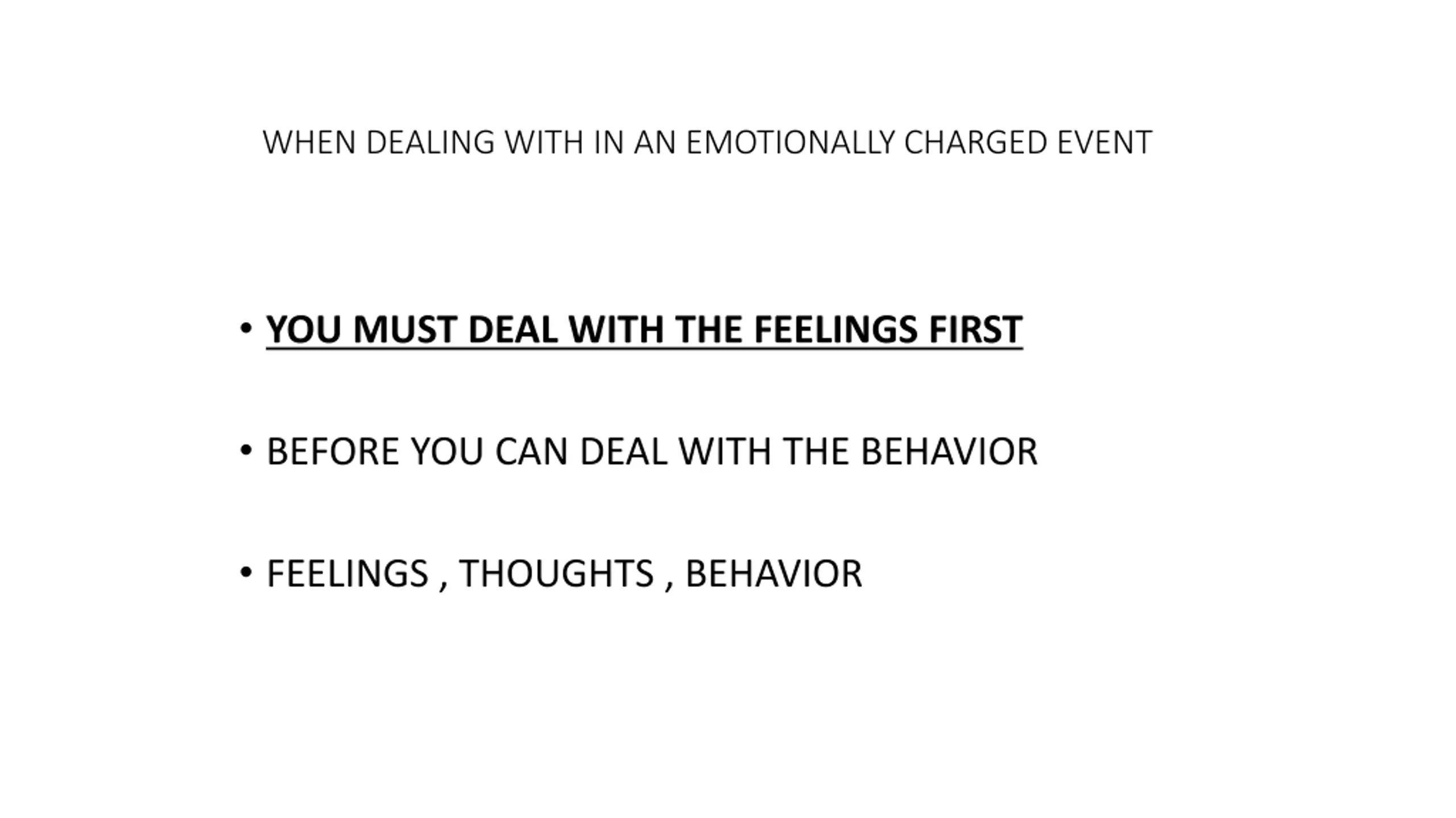WHEN DEALING WITH IN AN EMOTIONALLY CHARGED EVENT YOU MUST DEAL WITH THE FEELINGS FIRST BEFORE YOU CAN DEAL WITH THE BEHAVIOR FEELINGS , THOUGHTS , BEHAVIOR