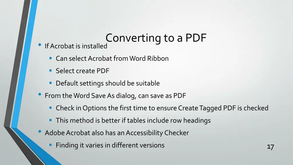 Converting to a PDF If Acrobat is installed Can select Acrobat from Word Ribbon Select create PDF Default settings should be suitable From the Word Save As dialog, can save as PDF Check in Options the first time to ensure Create Tagged PDF is checked This method is better if tables include row headings Adobe Acrobat also has an Accessibility Checker Finding it varies in different versions 17