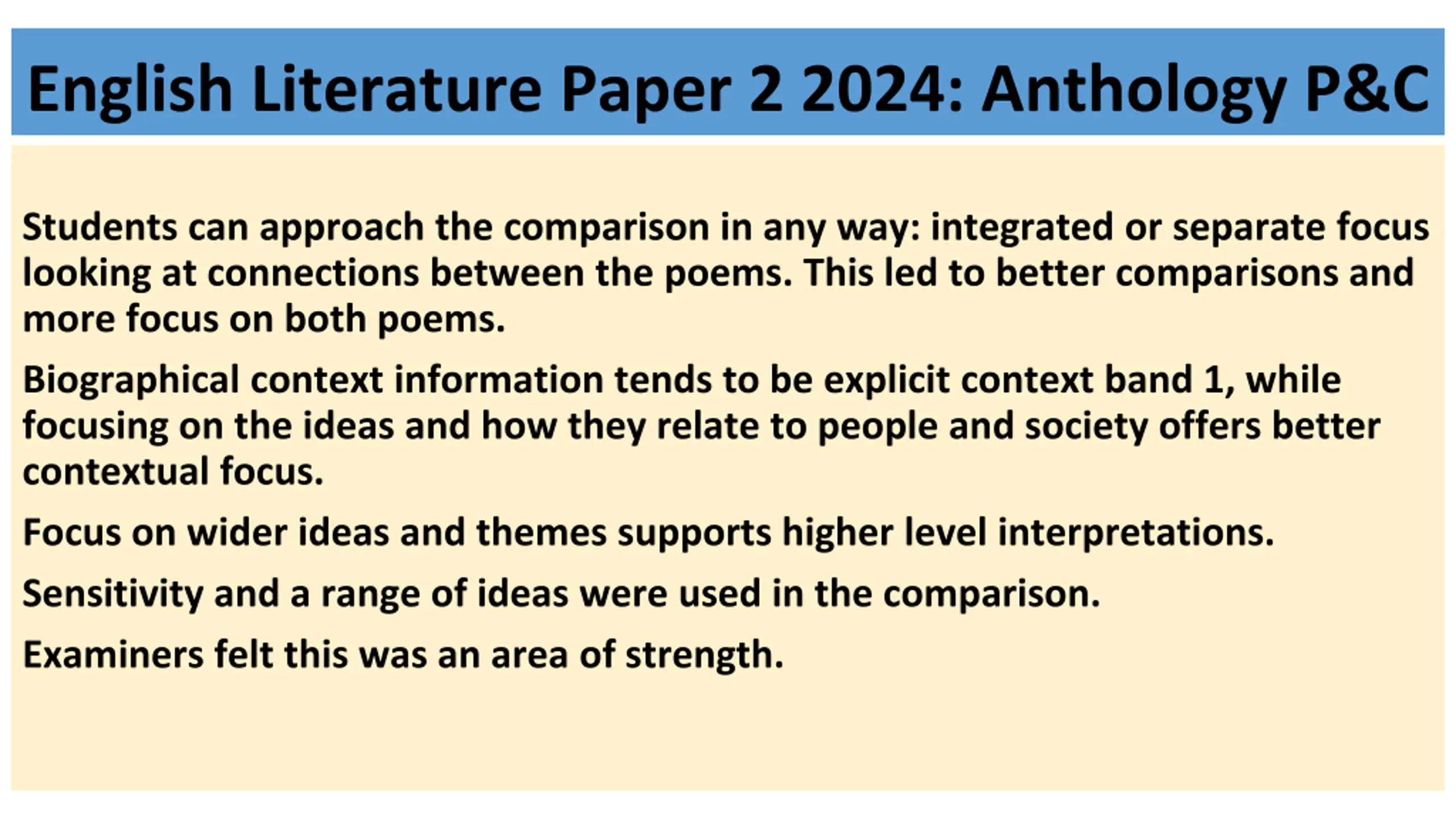 English Literature Paper 2 2024: Anthology P&C Students can approach the comparison in any way: integrated or separate focus looking at connections between the poems. This led to better comparisons and more focus on both poems. Biographical context information tends to be explicit context band 1, while focusing on the ideas and how they relate to people and society offers better contextual focus. Focus on wider ideas and themes supports higher level interpretations. Sensitivity and a range of ideas were used in the comparison. Examiners felt this was an area of strength.