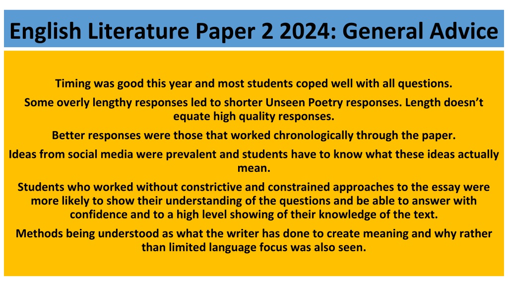 English Literature Paper 2 2024: General Advice Timing was good this year and most students coped well with all questions. Some overly lengthy responses led to shorter Unseen Poetry responses. Length doesn t equate high quality responses. Better responses were those that worked chronologically through the paper. Ideas from social media were prevalent and students have to know what these ideas actually mean. Students who worked without constrictive and constrained approaches to the essay were more likely to show their understanding of the questions and be able to answer with confidence and to a high level showing of their knowledge of the text. Methods being understood as what the writer has done to create meaning and why rather than limited language focus was also seen.