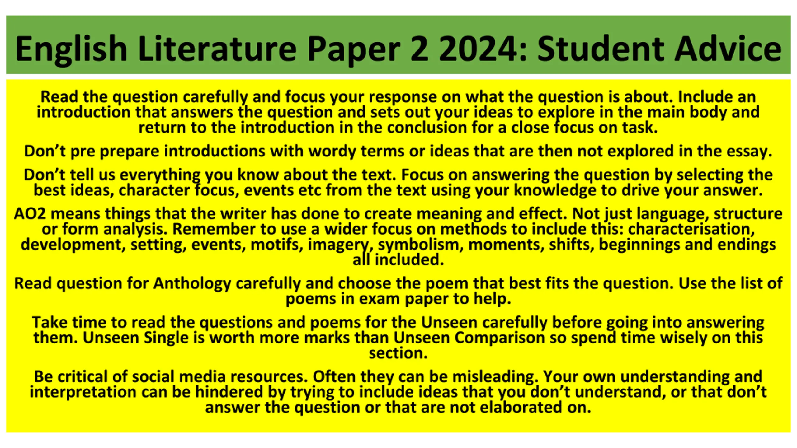English Literature Paper 2 2024: Student Advice Read the question carefully and focus your response on what the question is about. Include an introduction that answers the question and sets out your ideas to explore in the main body and return to the introduction in the conclusion for a close focus on task. Don t pre prepare introductions with wordy terms or ideas that are then not explored in the essay. Don t tell us everything you know about the text. Focus on answering the question by selecting the best ideas, character focus, events etc from the text using your knowledge to drive your answer. AO2 means things that the writer has done to create meaning and effect. Not just language, structure or form analysis. Remember to use a wider focus on methods to include this: characterisation, development, setting, events, motifs, imagery, symbolism, moments, shifts, beginnings and endings all included. Read question for Anthology carefully and choose the poem that best fits the question. Use the list of poems in exam paper to help. Take time to read the questions and poems for the Unseen carefully before going into answering them. Unseen Single is worth more marks than Unseen Comparison so spend time wisely on this section. Be critical of social media resources. Often they can be misleading. Your own understanding and interpretation can be hindered by trying to include ideas that you don t understand, or that don t answer the question or that are not elaborated on.