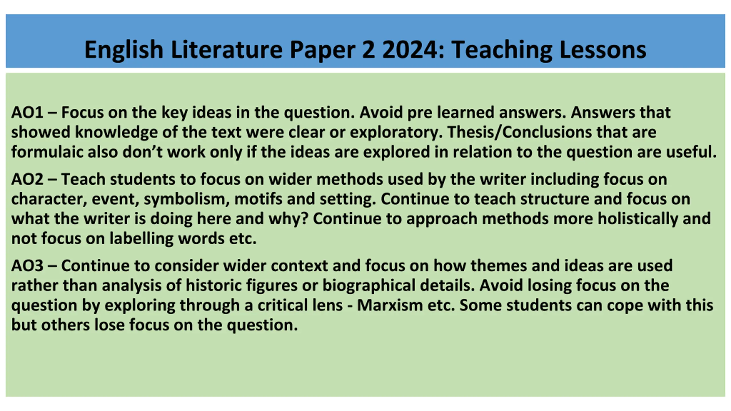 English Literature Paper 2 2024: Teaching Lessons AO1 Focus on the key ideas in the question. Avoid pre learned answers. Answers that showed knowledge of the text were clear or exploratory. Thesis/Conclusions that are formulaic also don t work only if the ideas are explored in relation to the question are useful. AO2 Teach students to focus on wider methods used by the writer including focus on character, event, symbolism, motifs and setting. Continue to teach structure and focus on what the writer is doing here and why? Continue to approach methods more holistically and not focus on labelling words etc. AO3 Continue to consider wider context and focus on how themes and ideas are used rather than analysis of historic figures or biographical details. Avoid losing focus on the question by exploring through a critical lens - Marxism etc. Some students can cope with this but others lose focus on the question.