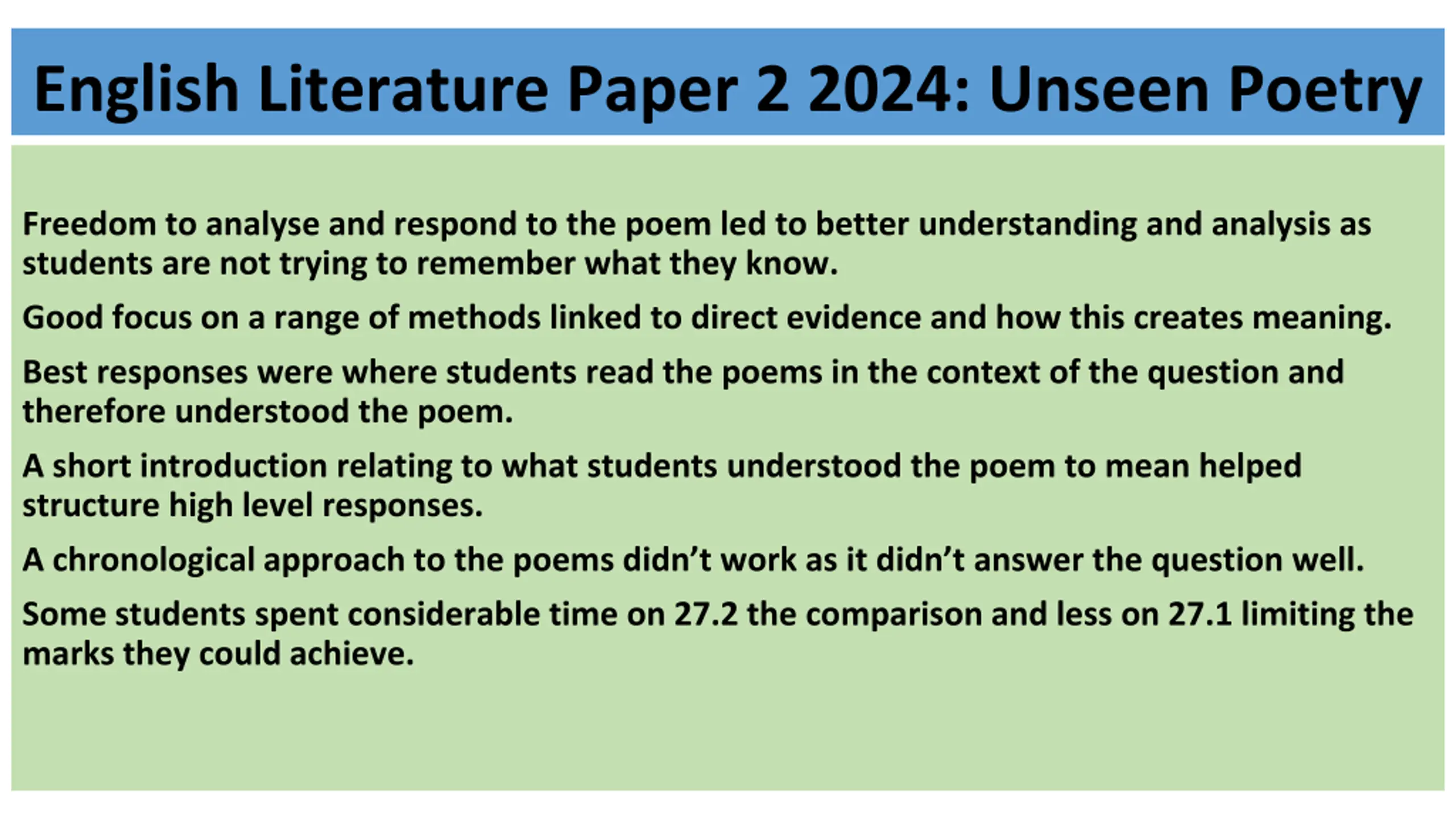 English Literature Paper 2 2024: Unseen Poetry Freedom to analyse and respond to the poem led to better understanding and analysis as students are not trying to remember what they know. Good focus on a range of methods linked to direct evidence and how this creates meaning. Best responses were where students read the poems in the context of the question and therefore understood the poem. A short introduction relating to what students understood the poem to mean helped structure high level responses. A chronological approach to the poems didn t work as it didn t answer the question well. Some students spent considerable time on 27.2 the comparison and less on 27.1 limiting the marks they could achieve.