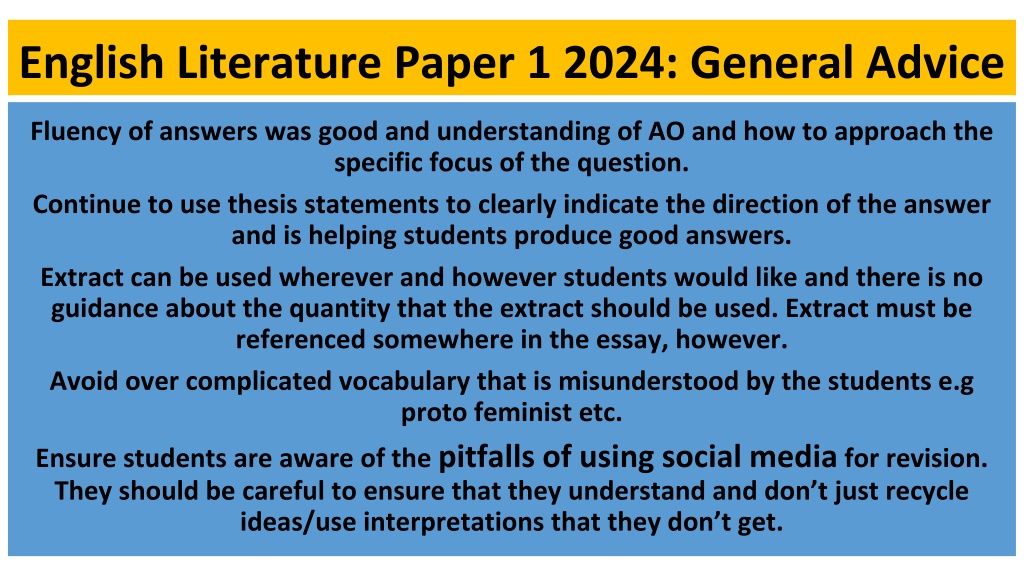 English Literature Paper 1 2024: General Advice Fluency of answers was good and understanding of AO and how to approach the specific focus of the question. Continue to use thesis statements to clearly indicate the direction of the answer and is helping students produce good answers. Extract can be used wherever and however students would like and there is no guidance about the quantity that the extract should be used. Extract must be referenced somewhere in the essay, however. Avoid over complicated vocabulary that is misunderstood by the students e.g proto feminist etc. Ensure students are aware of the pitfalls of using social media for revision. They should be careful to ensure that they understand and don t just recycle ideas/use interpretations that they don t get.