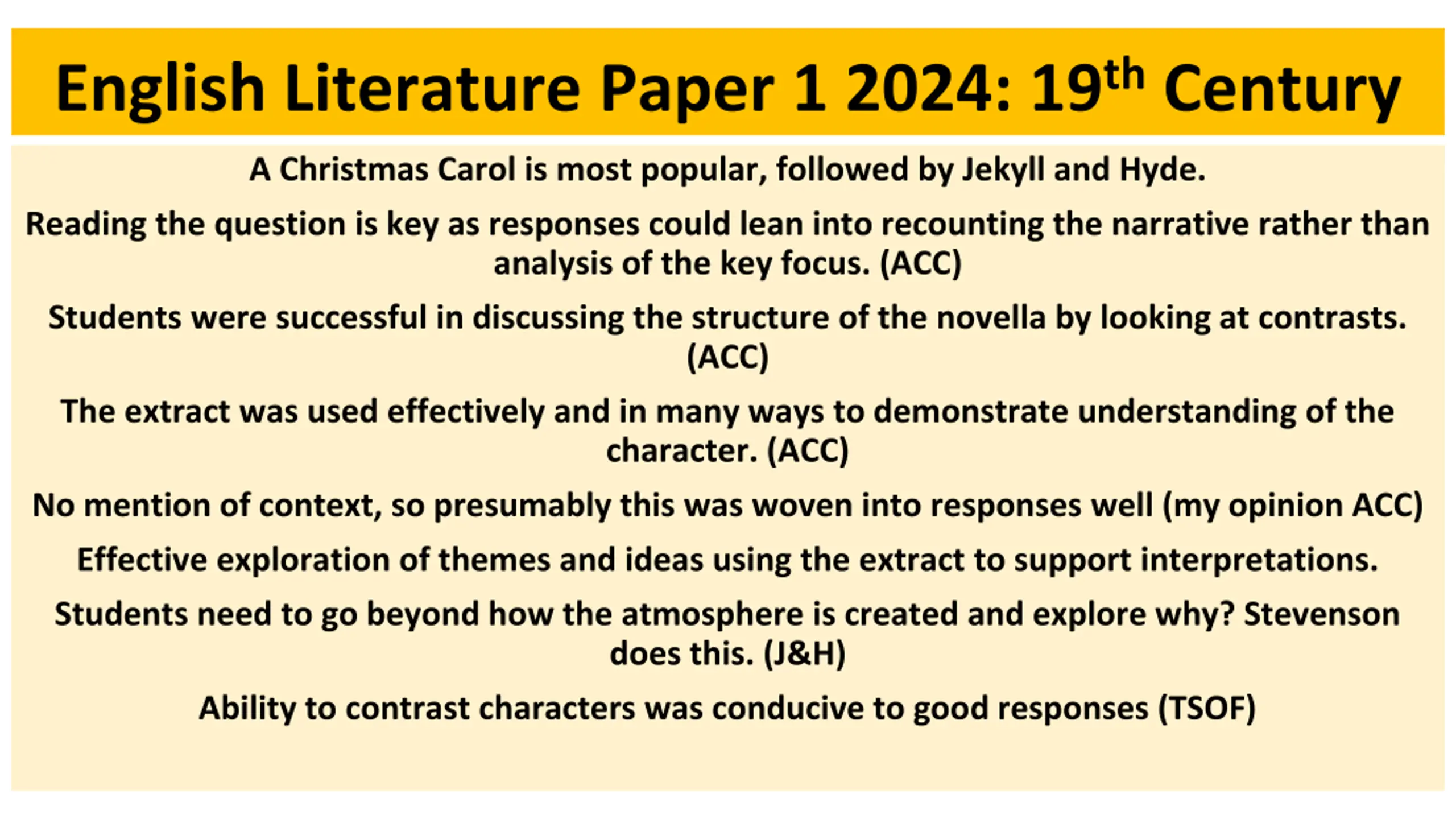 English Literature Paper 1 2024: 19thCentury A Christmas Carol is most popular, followed by Jekyll and Hyde. Reading the question is key as responses could lean into recounting the narrative rather than analysis of the key focus. (ACC) Students were successful in discussing the structure of the novella by looking at contrasts. (ACC) The extract was used effectively and in many ways to demonstrate understanding of the character. (ACC) No mention of context, so presumably this was woven into responses well (my opinion ACC) Effective exploration of themes and ideas using the extract to support interpretations. Students need to go beyond how the atmosphere is created and explore why? Stevenson does this. (J&H) Ability to contrast characters was conducive to good responses (TSOF)
