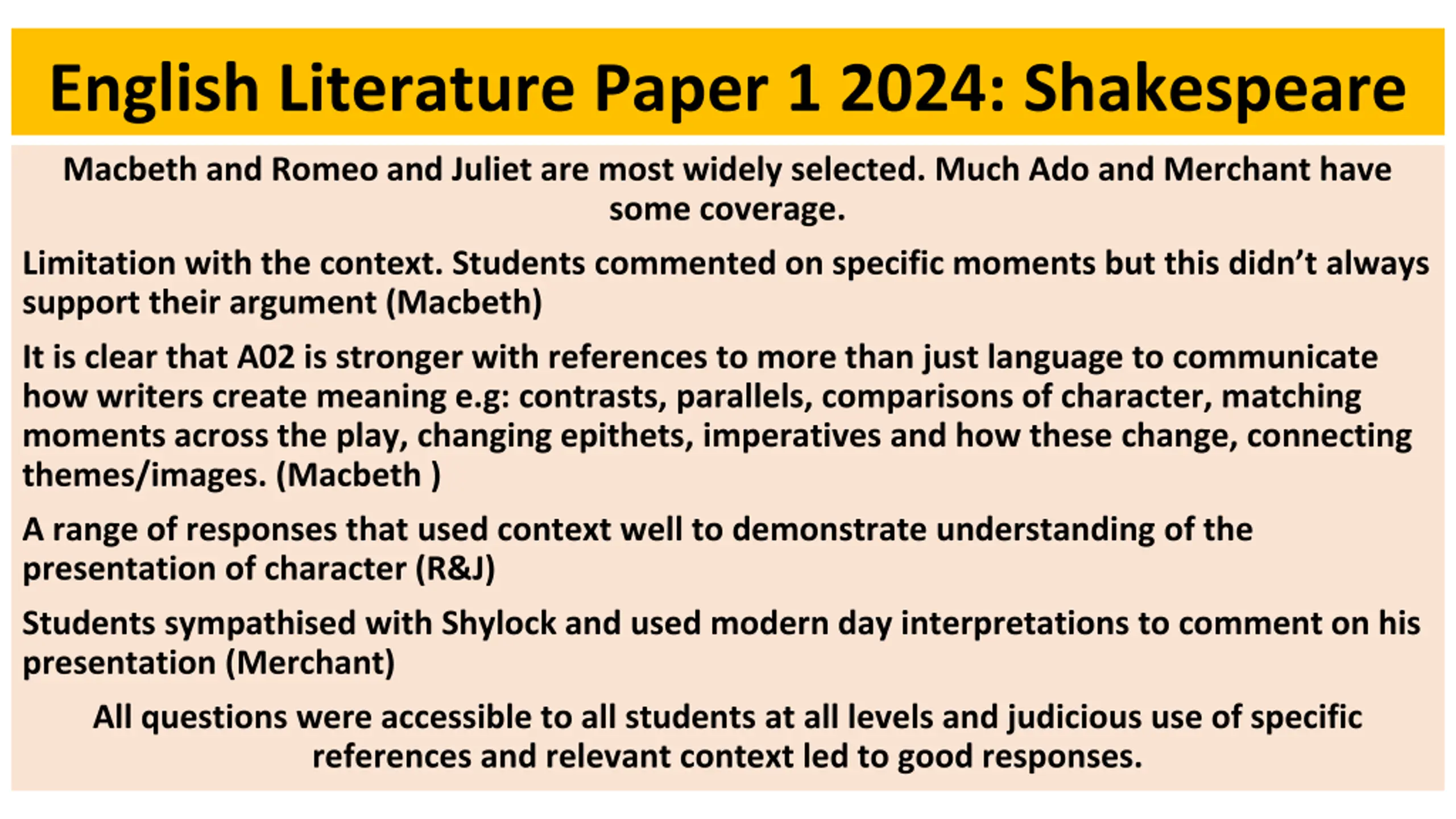 English Literature Paper 1 2024: Shakespeare Macbeth and Romeo and Juliet are most widely selected. Much Ado and Merchant have some coverage. Limitation with the context. Students commented on specific moments but this didn t always support their argument (Macbeth) It is clear that A02 is stronger with references to more than just language to communicate how writers create meaning e.g: contrasts, parallels, comparisons of character, matching moments across the play, changing epithets, imperatives and how these change, connecting themes/images. (Macbeth ) A range of responses that used context well to demonstrate understanding of the presentation of character (R&J) Students sympathised with Shylock and used modern day interpretations to comment on his presentation (Merchant) All questions were accessible to all students at all levels and judicious use of specific references and relevant context led to good responses.