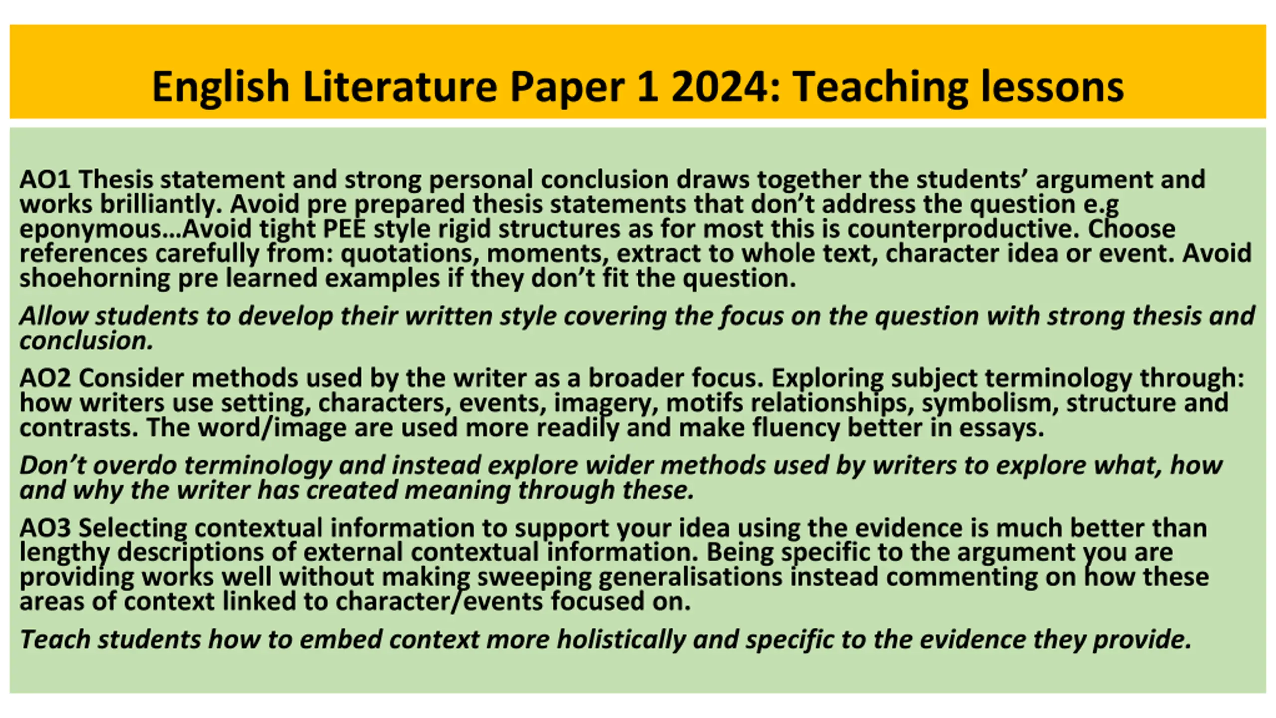 English Literature Paper 1 2024: Teaching lessons AO1 Thesis statement and strong personal conclusion draws together the students argument and works brilliantly. Avoid pre prepared thesis statements that don t address the question e.g eponymous Avoid tight PEE style rigid structures as for most this is counterproductive. Choose references carefully from: quotations, moments, extract to whole text, character idea or event. Avoid shoehorning pre learned examples if they don t fit the question. Allow students to develop their written style covering the focus on the question with strong thesis and conclusion. AO2 Consider methods used by the writer as a broader focus. Exploring subject terminology through: how writers use setting, characters, events, imagery, motifs relationships, symbolism, structure and contrasts. The word/image are used more readily and make fluency better in essays. Don t overdo terminology and instead explore wider methods used by writers to explore what, how and why the writer has created meaning through these. AO3 Selecting contextual information to support your idea using the evidence is much better than lengthy descriptions of external contextual information. Being specific to the argument you are providing works well without making sweeping generalisations instead commenting on how these areas of context linked to character/events focused on. Teach students how to embed context more holistically and specific to the evidence they provide.
