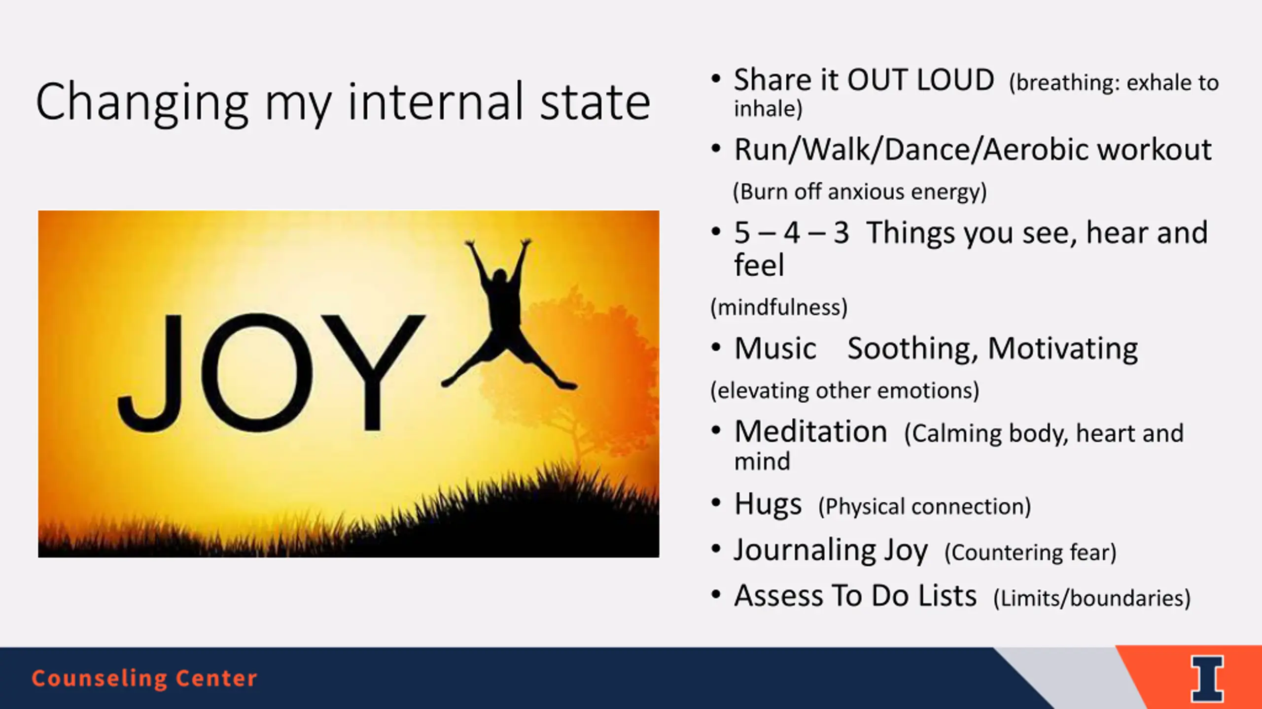 Share it OUT LOUD (breathing: exhale to inhale) Run/Walk/Dance/Aerobic workout (Burn off anxious energy) 5 4 3 Things you see, hear and feel (mindfulness) Music Soothing, Motivating (elevating other emotions) Meditation (Calming body, heart and mind Hugs (Physical connection) Journaling Joy (Countering fear) Assess To Do Lists (Limits/boundaries) Changing my internal state